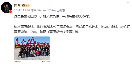 除雷军外,小米多名高管的社交账号IP地址均显示在新疆,显示核心团队正共同参与此次测试。雷军发布的合照显示,测试团队在昆仑山脚下集结,开展包括高原续航、充电等多项测试。值得注意的是,此前小米 SU7 与 YU7 发布前均有类似高管路测先例,此举或预示 YU9 已接近发布阶段。