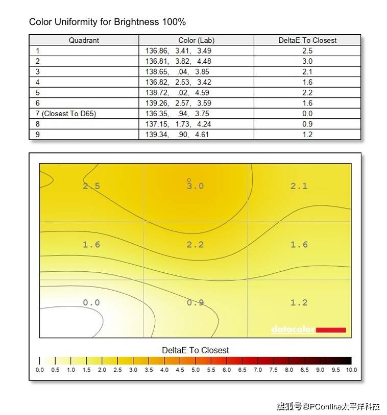 在100%亮度下,HKC UG25EF的色彩均匀性相当出色,最接近D65标准的区域为7号区域,而其他区域与7号区域的最大差值ΔE只有3.0,为屏幕上方中央的的2号区域,这样的测试结果证明,在显示画面时,HKC UG25EF的色彩一致性极高。