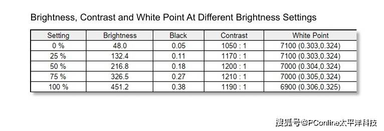 在亮度测试中,HKC UG25EF的表现相当出色,最高亮度可达 451.2 nit(100% 亮度设置下)。如此高的亮度上限确保了即使在明亮的环境下,显示器也能提供清晰的显示效果。