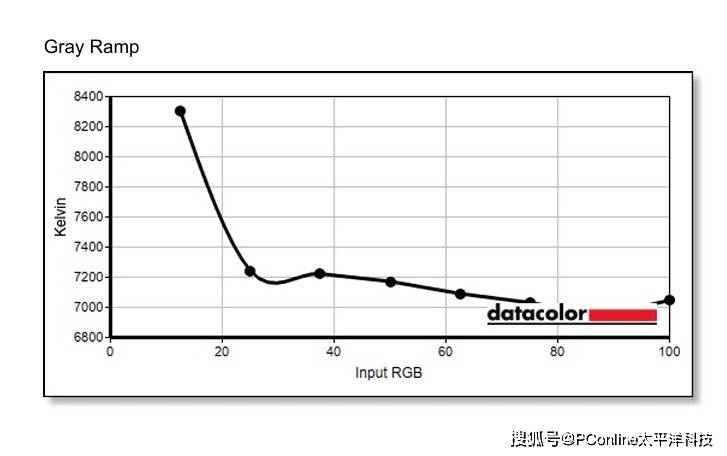 灰阶表现方面,HKC UG25EF的色温曲线在不同灰度下有较为明显的波动,整体在 7000K 至 8300K 之间浮动,但波动的曲线相对平滑 。