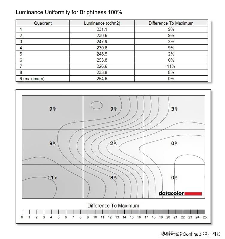至于亮度均匀性方面,HKC UG25EF的表现还算不错,在100%的最大亮度下,HKC UG25EF的屏幕表现为左侧整体偏亮,其中最大的亮度偏差区域出现在屏幕左下角,差值为11%。