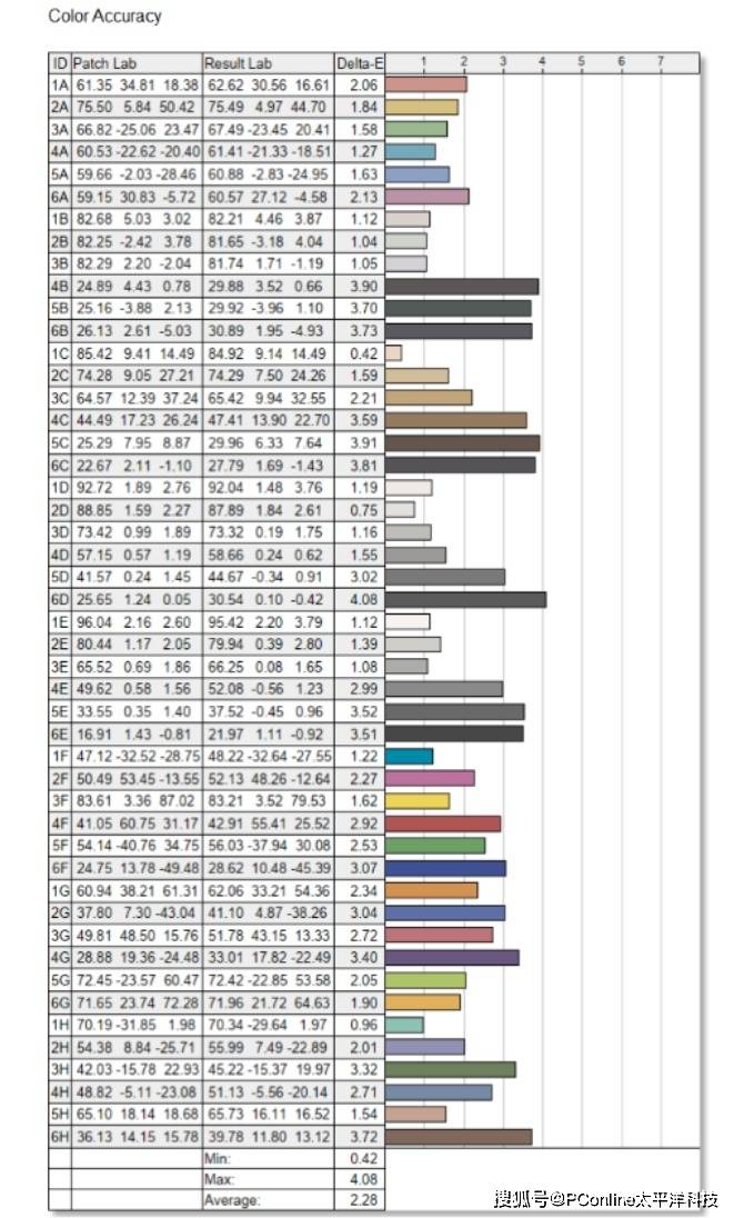 色准方面, HKC UG25EF 的表现则较为一般。在预设模式下,其平均ΔE值约为 2.28,最大 ΔE 值达到4.08。考虑到HKC UG25EF是一款专注于超高刷新率和响应速度的超高刷电竞显示器,这样的色准表现仍在可接受范围内,其主要优势仍在于极致的动态性能。