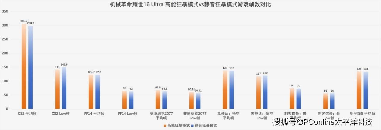 关键是,游戏体验几乎没差!“高能狂暴模式”平均305帧,“静音狂暴模式”平均298帧,这点差距在实际游戏中根本感觉不到,依旧是丝般顺滑。