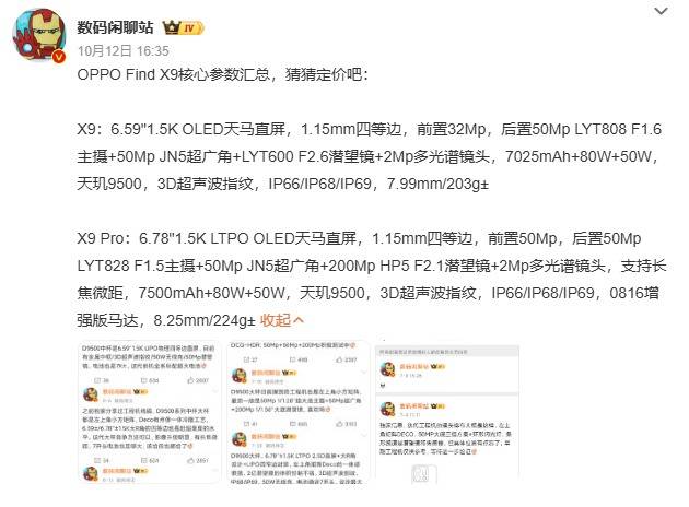 根据此前博主数码闲聊站曝光的参数信息,Find X9标准版将搭载6.59英寸1.5K OLED天马直屏,后置5000万像素LYT808主摄+5000万像素JN5超广角+LYT600潜望镜+200万像素多光谱镜头组合,内置7025mAh电池,支持80W有线和50W无线充电,搭载天玑9500芯片,整机厚度7.99mm,重量约203克。