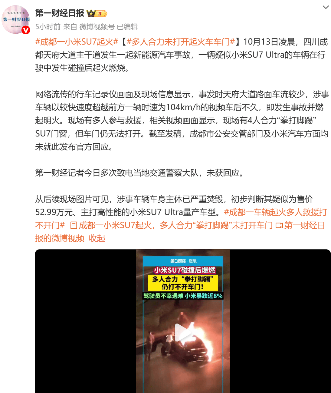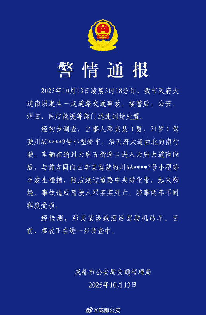 【太平洋科技】据成都市公安局交通管理局 10 月 13 日通报,当日凌晨 3 时 18 分许,天府大道南段发生一起交通事故。一辆川 ACC****9 号小型轿车(经第一财经报道证实为小米 SU7 Ultra)在天府五街路口与同向行驶的川 AA****3 号车辆发生碰撞后,越过中央绿化带并起火燃烧。