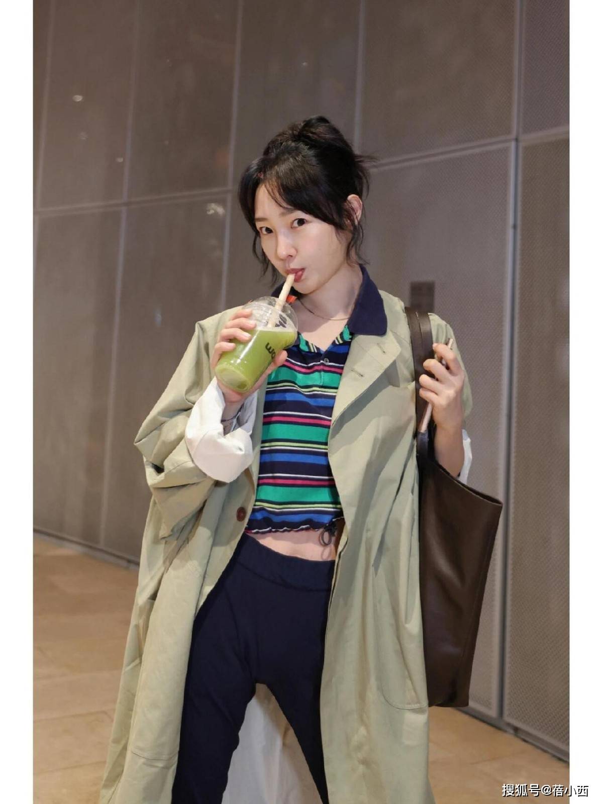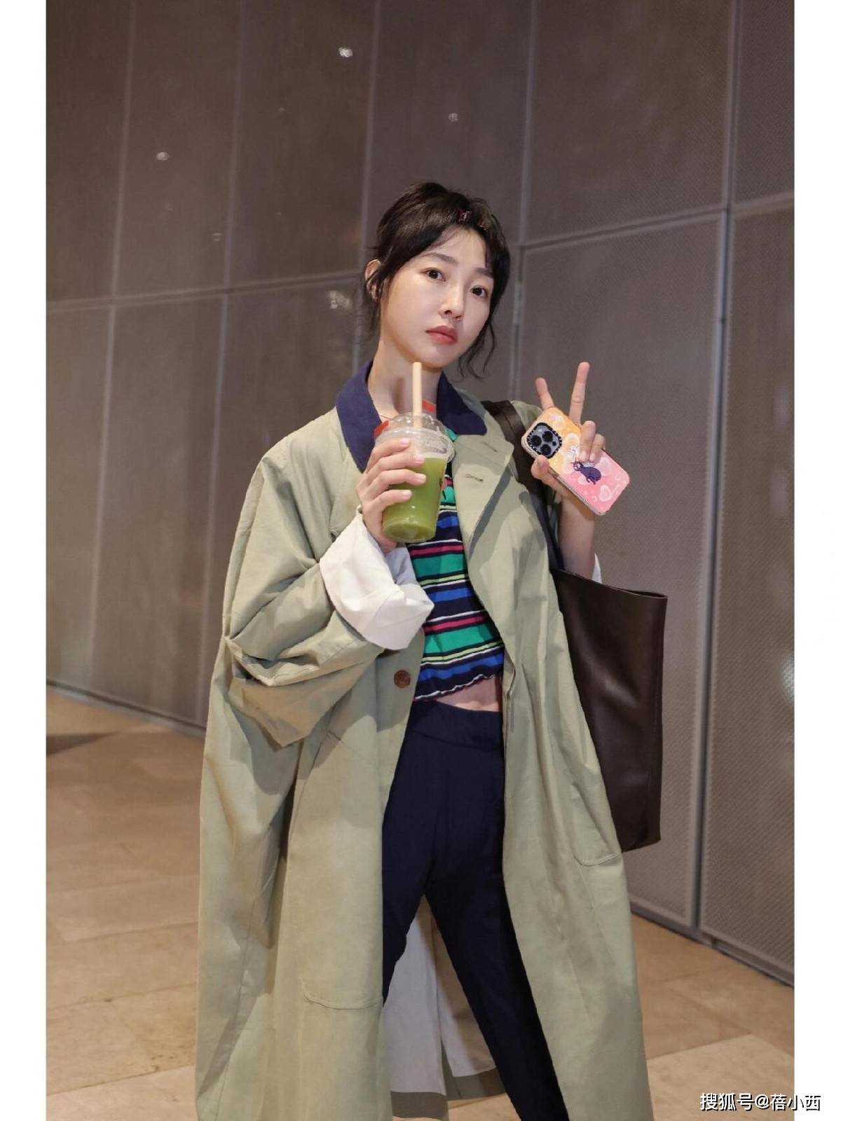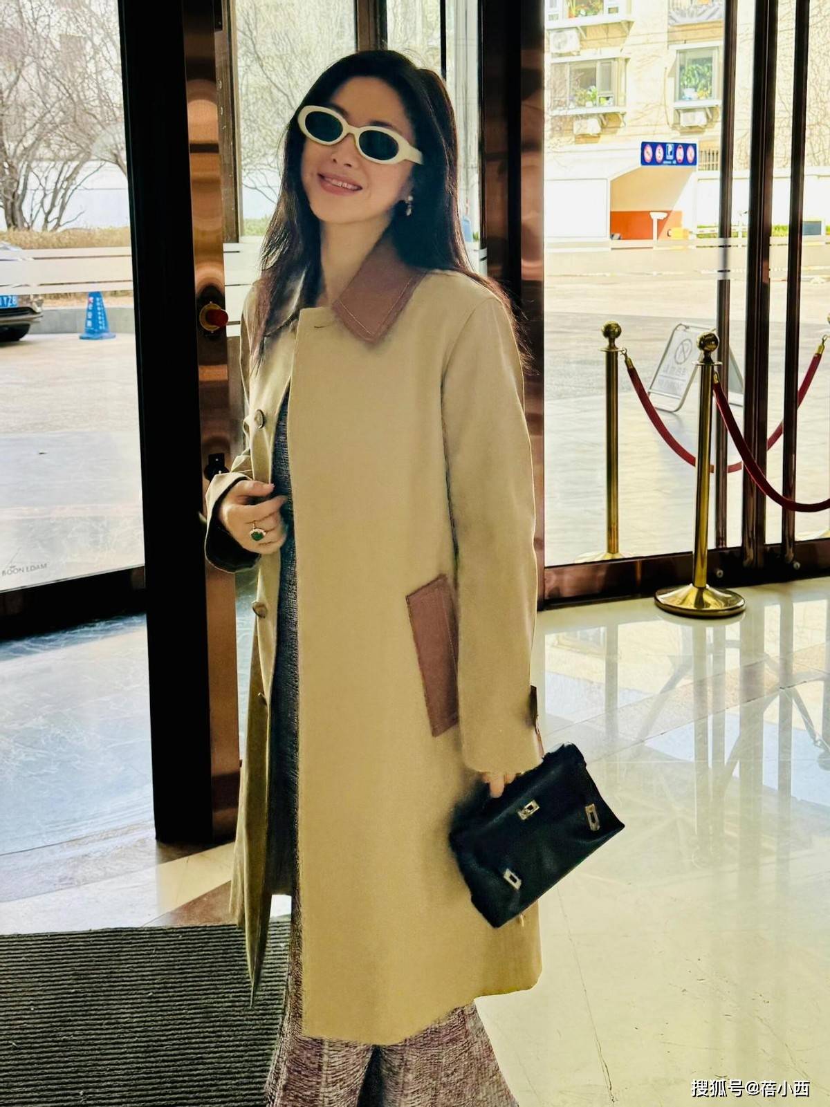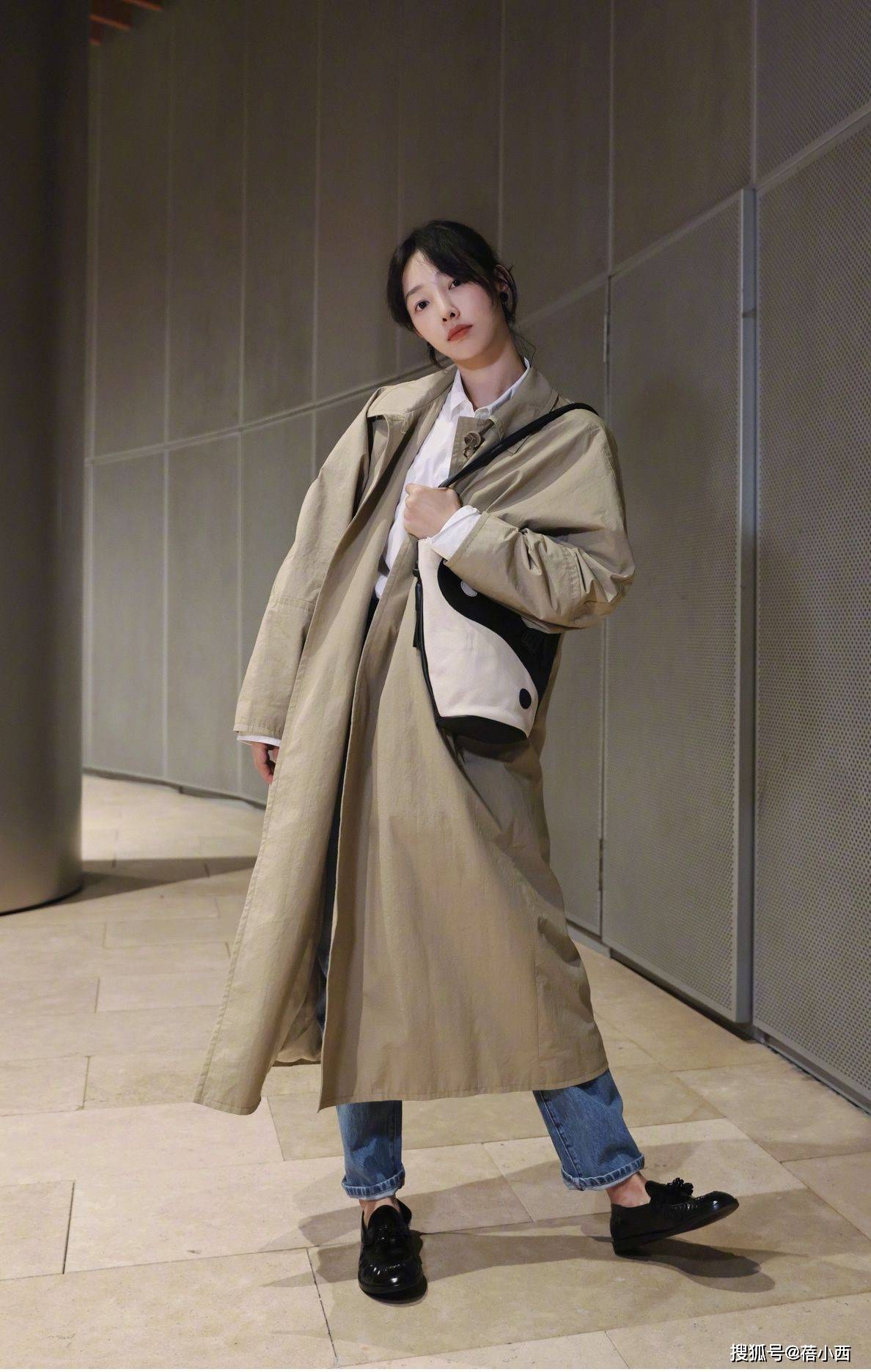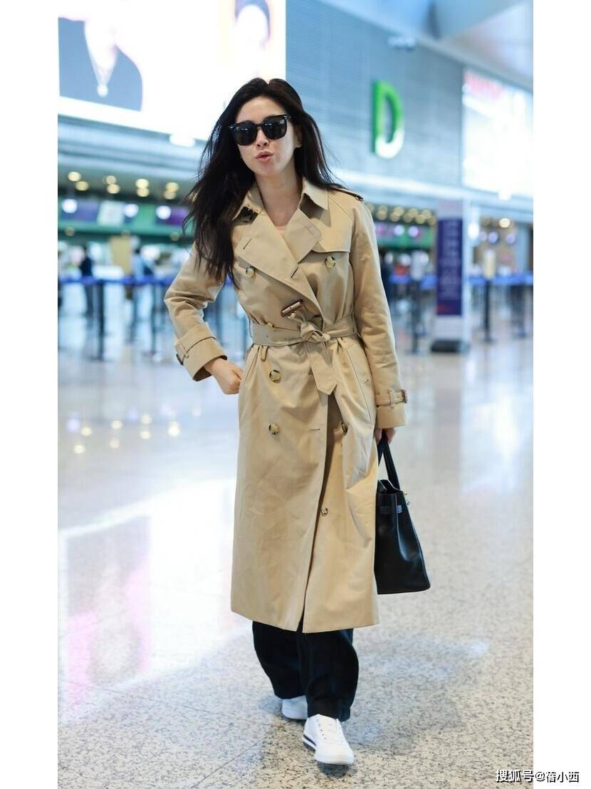 整个搭配看似简单,其实很有心思,黑色阔腿裤把风衣的正式感中和得刚刚好,宽松的裤型透着随性,和风衣的利落形成反差,这种“松与紧”的平衡,是她穿搭的精髓。脚上的白色运动鞋又添了几分休闲,让整套造型不至于太“端着”,日常出街、赶飞机都舒服自在。