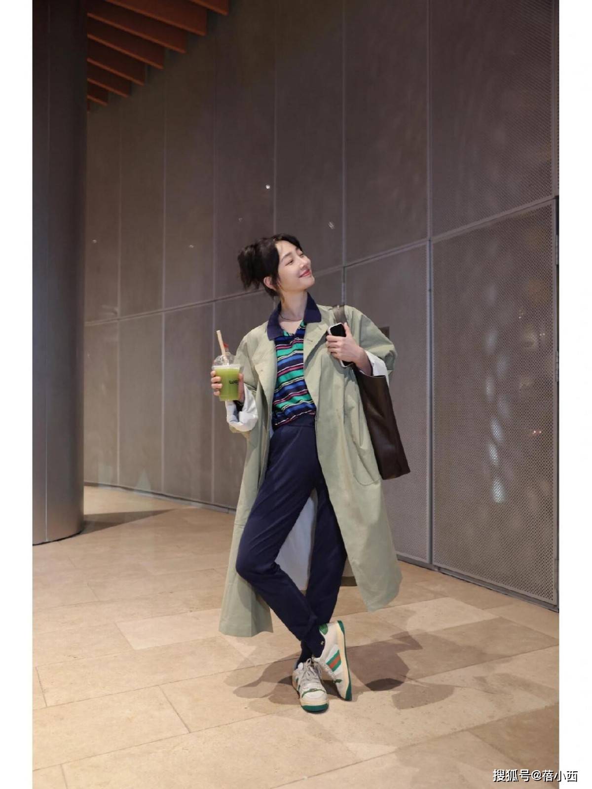 最点睛的是那双复古运动鞋,白绿撞色与风衣、内搭形成呼应,让整体风格在“高级感”与“舒适感”之间自由切换。