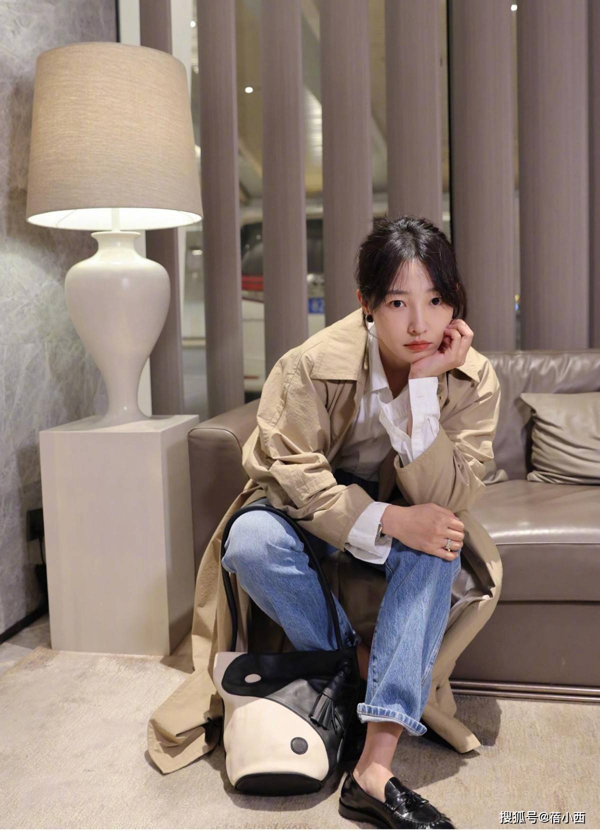 下装的蓝色牛仔裤则打破了卡其风衣的沉闷感,裤脚的卷边设计带着几分复古腔调,与风衣的经典属性呼应。而脚上的黑色乐福鞋则是“精致感”的点睛之笔,哑光皮质的质感高级,鞋头的流苏装饰又添了几分俏皮,中和了牛仔裤的随性。
