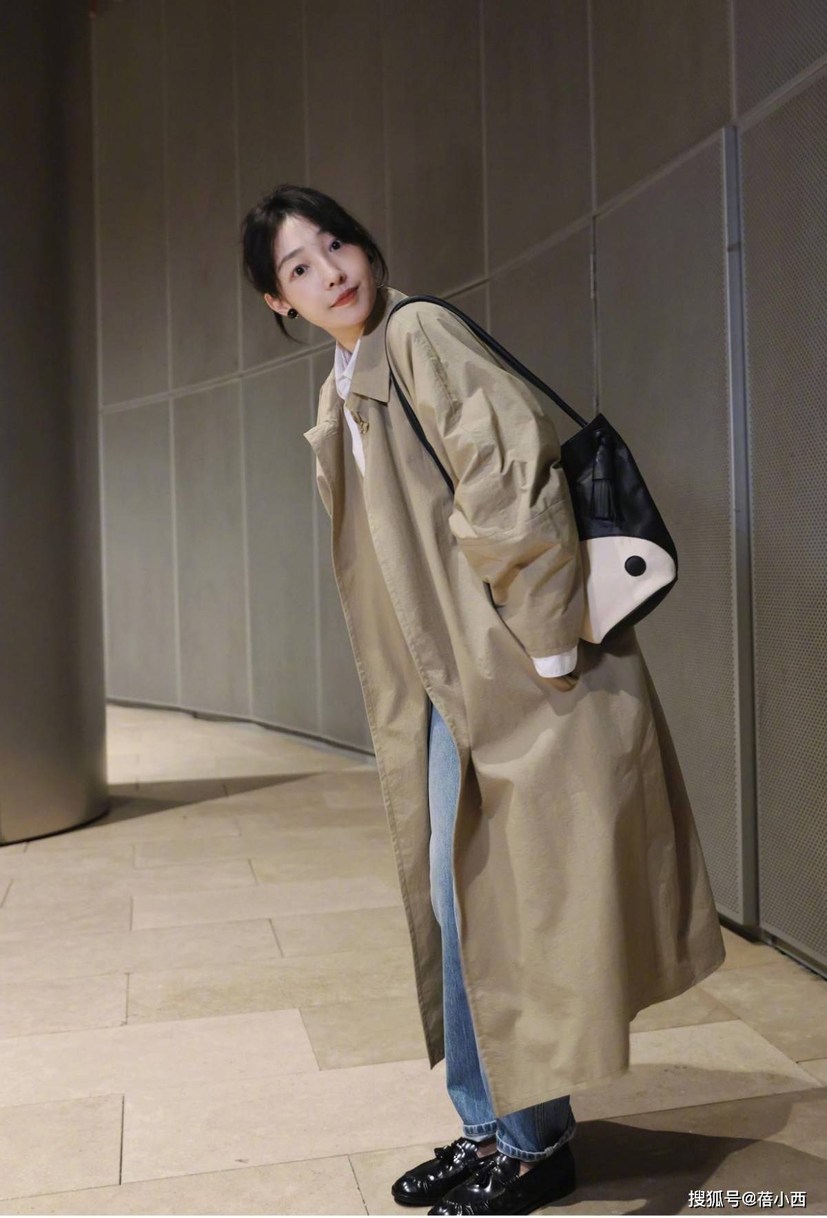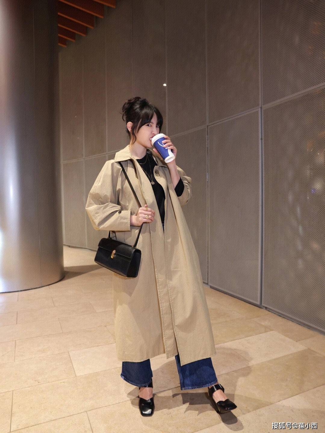 白百何的风衣穿搭之所以好看,就在于她从不会让造型“一板一眼”。不管是颜色的搭配、版型的选择,还是配饰的点缀,都很有细节,比如这一身搭配中,用卡其色风衣配深蓝色牛仔裤,挎着黑色包包,简约还显贵。