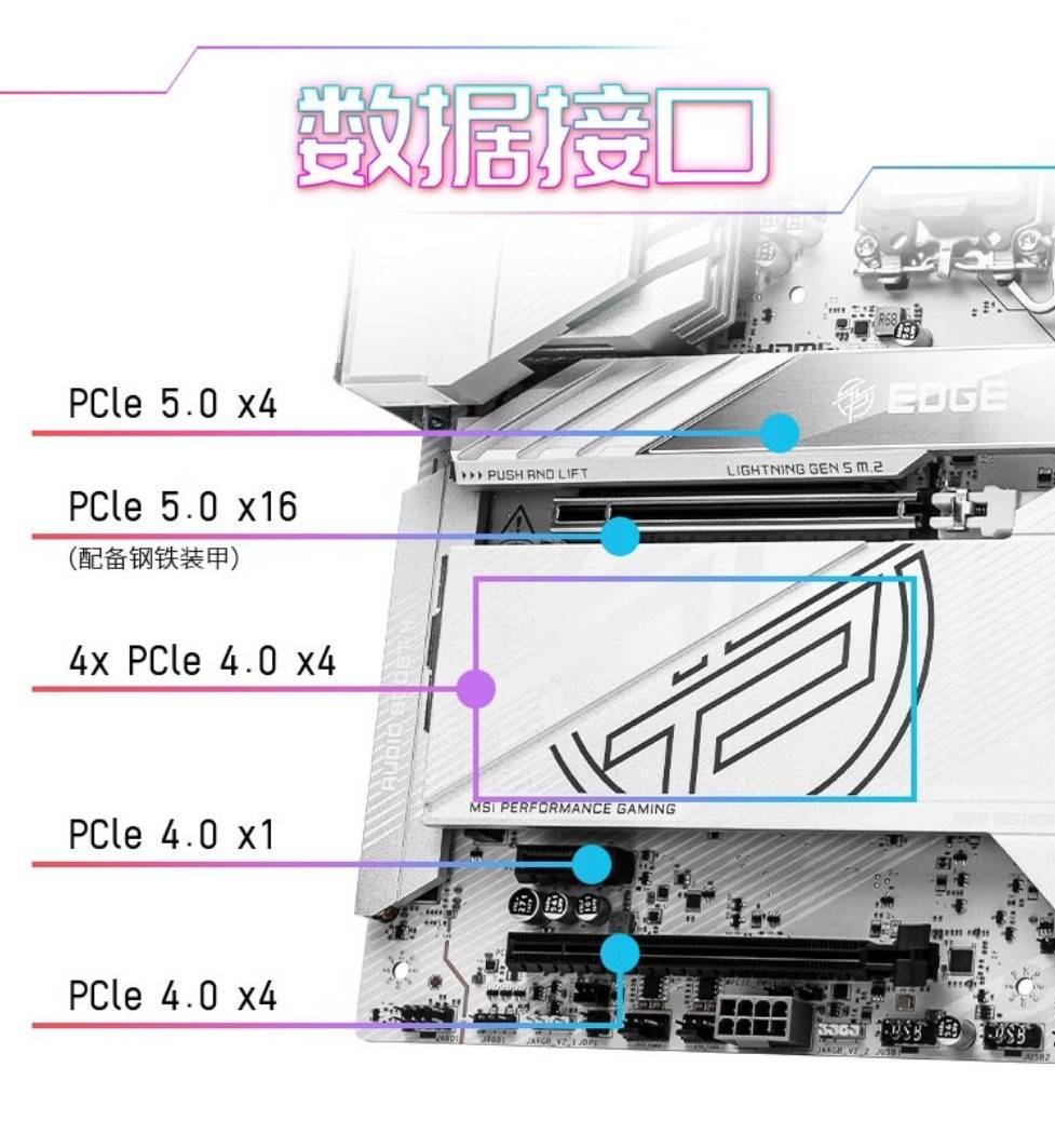 与AMD版本相似,它同样搭载了多组PCIe插槽与多个M.2接口,其中PCIe插槽共3个,其中最顶部为PCIe 5.0×16速率,而硬盘插槽则包含五组,其中一组为PCIe 5.0×4,其余均为PCIe 4.0×4,为高端显卡与存储设备提供充足带宽。