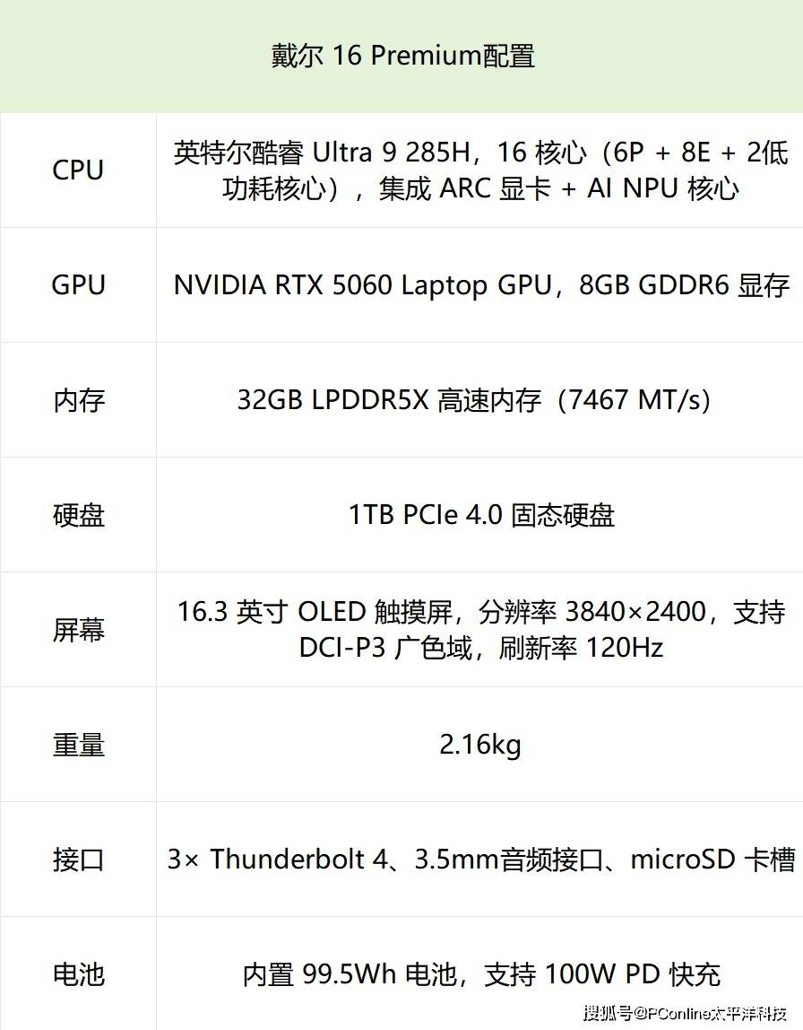直到最近,我深度使用了一台笔记本——Dell 16 Premium。它是戴尔科技全新定位的高端轻薄本系列,整机设计感彻底重塑,同时也没有像传统游戏本那样一味地堆料、强调自己是一台“性能怪兽”。无论是机身尺寸、电池容量、屏幕规格,还是酷睿Ultra 9 + RTX 5060的核心组合,这台机器在各个关键维度上都让我有种熟悉却又耳目一新的感觉。