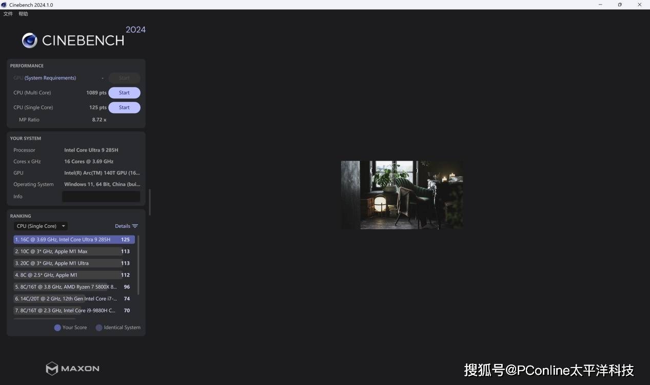 在新版 Cinebench 2024 中,该处理器的多核得分为1,089分,单核得分125分,超越了M1 Max和M1 Ultra,进一步印证了它在 IPC与频率方面的综合实力。作为一颗面向轻薄本市场的高性能处理器,酷睿Ultra 9 285H在理论性能层面已展现出明显进步,为后续内容创作、AI 运算等复合场景提供了坚实基础。