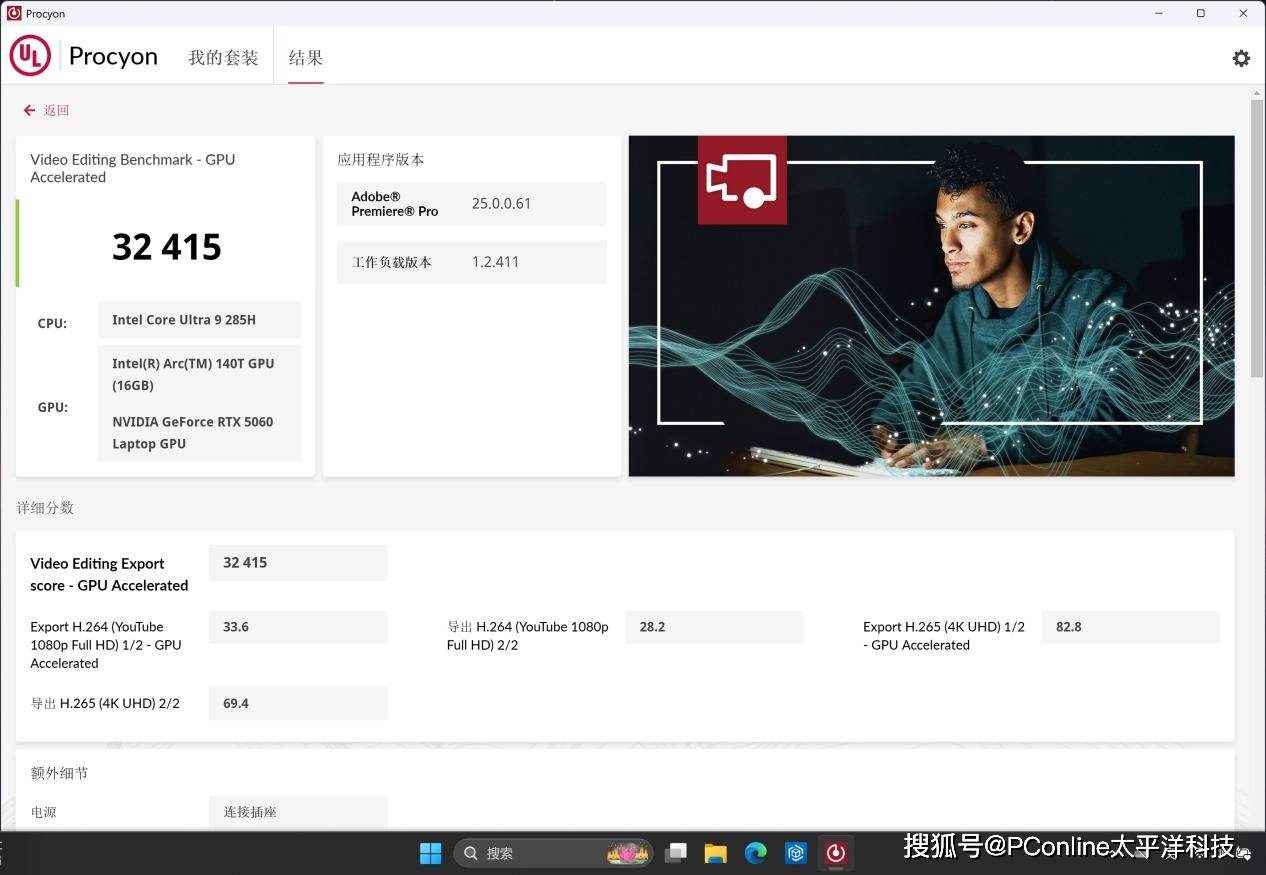 在视频剪辑测试中,使用Adobe Premiere Pro进行4K与1080P视频导出,最终获得32,415分,导出效率处于目前轻薄本中的较高水平。结合RTX 5060的GPU加速与Intel Arc GPU的协同输出,这套配置在H.264与H.265编码流程中的表现稳定,支持快速迭代工作流。