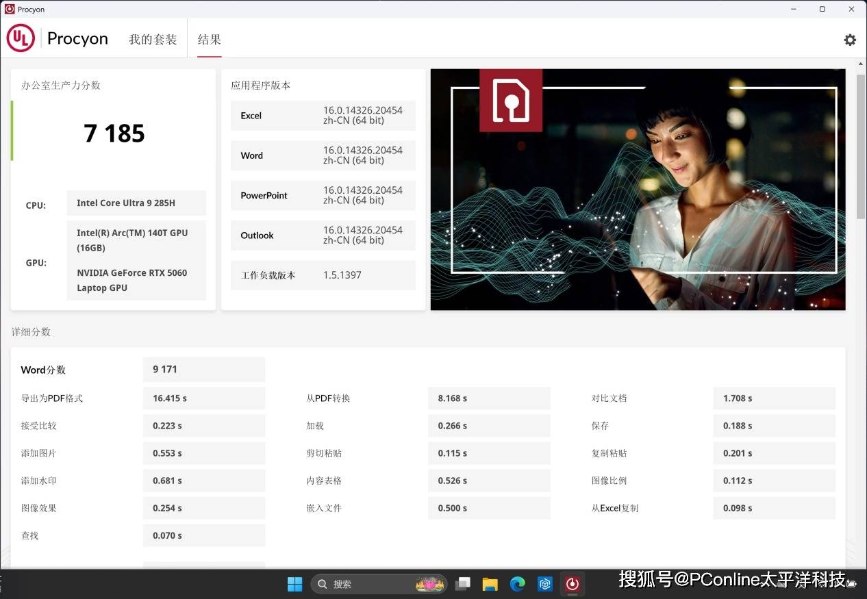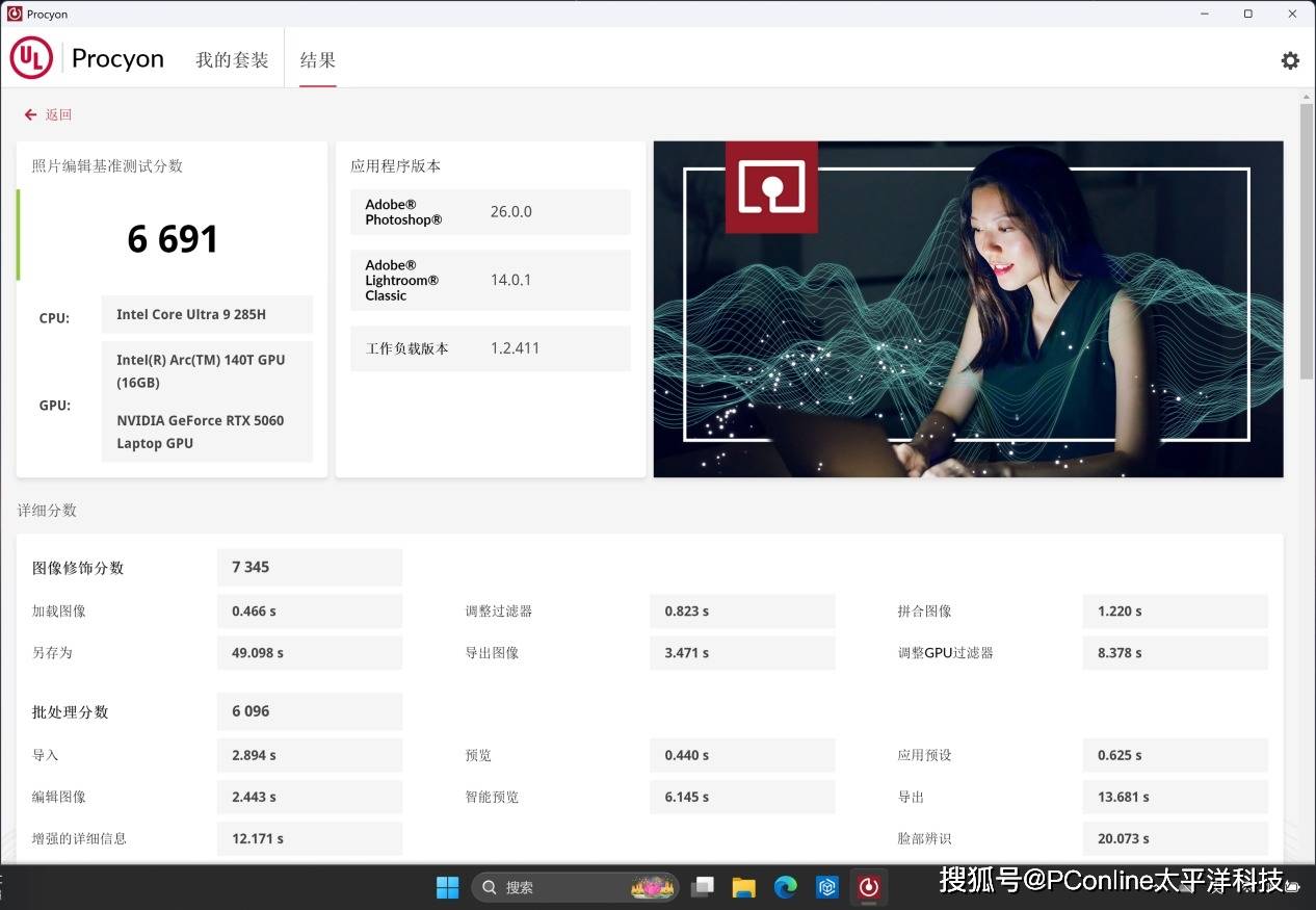 整体来看,这套Ultra 9 + RTX 5060的组合,在Procyon三项测试中展现出了较强的通用处理能力与图形加速效率,能够覆盖从文档办公到图形内容创作的大部分实际工作需求。