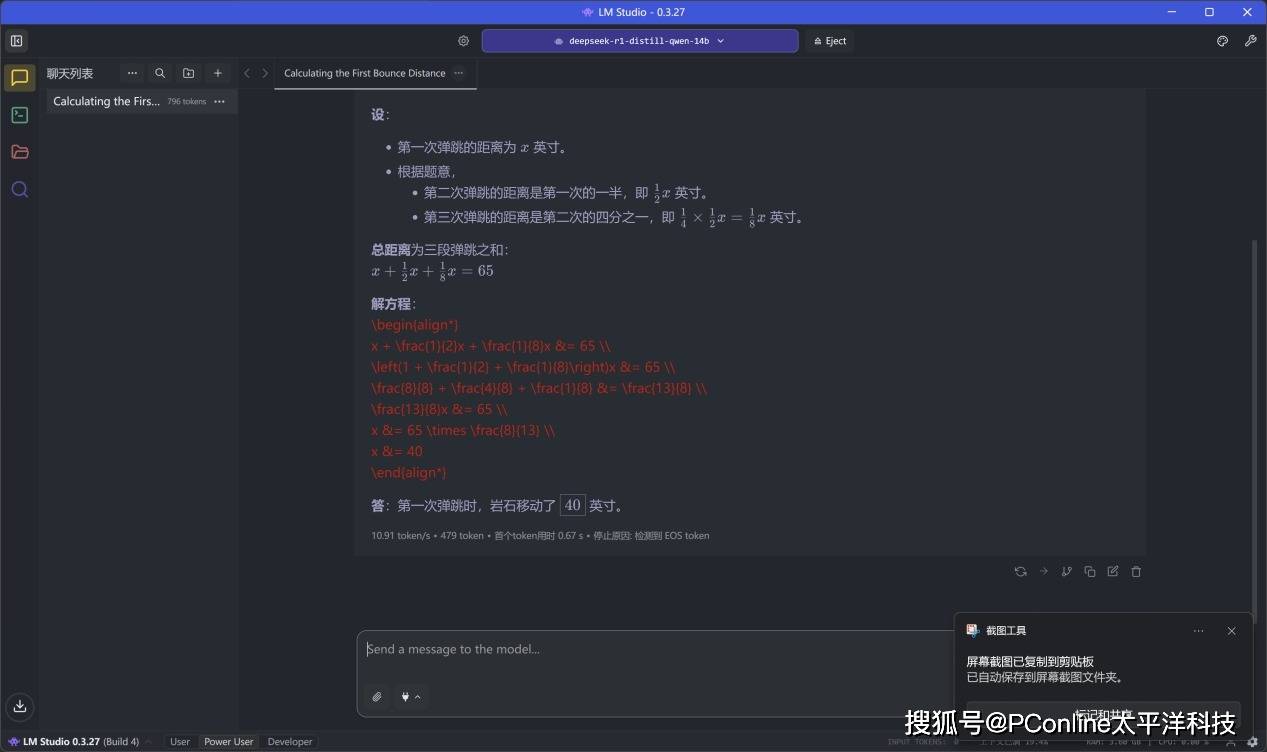 在运行Deepseek R1的14B模型时,首个Token的响应时间为0.67秒,整体生成速度达到10.91 tokens每秒;