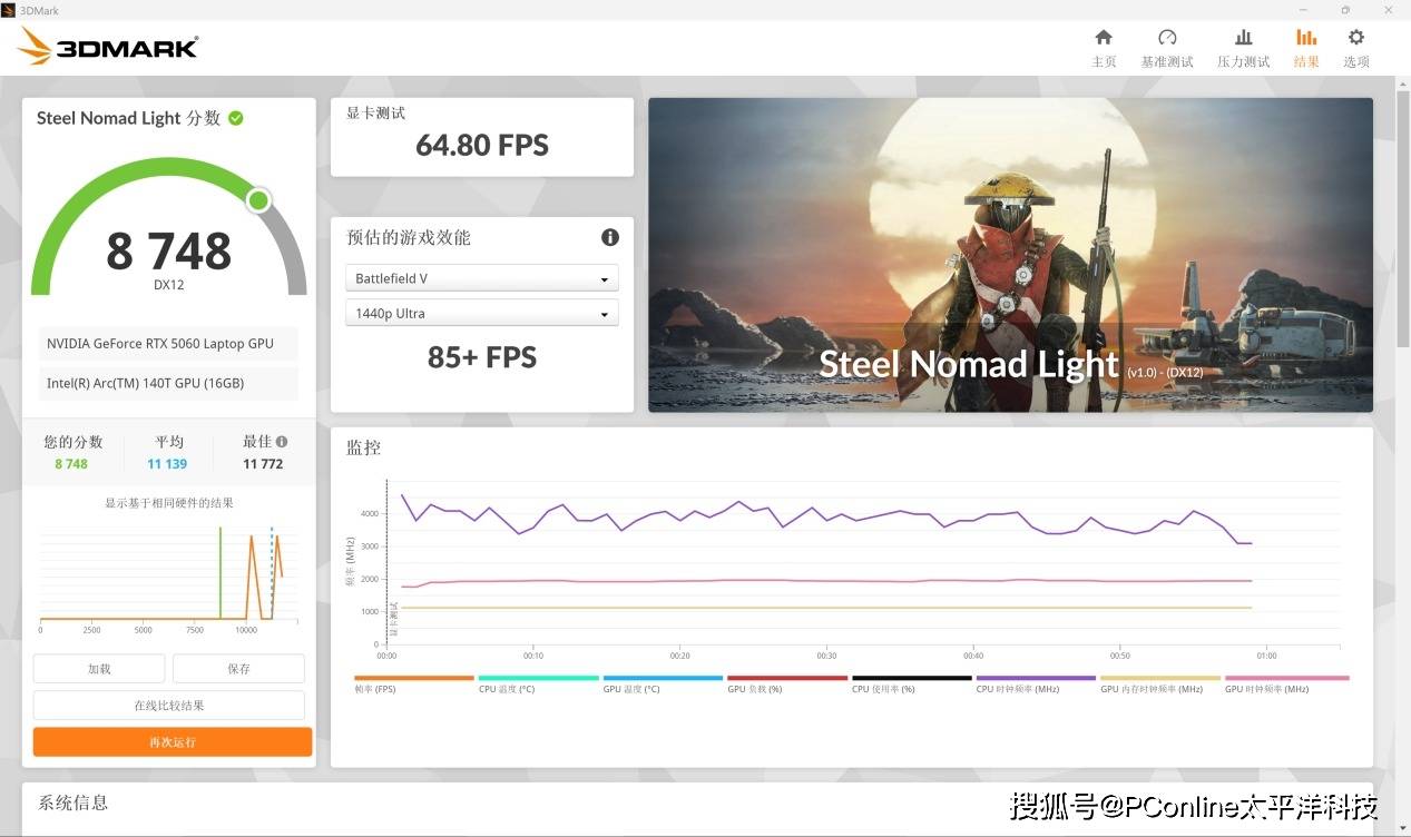 在3DMark的Time Spy和Steel Nomad Light两个项目中,机器分别拿下了9063和8748的总分,图形分数为8633和6480,对应的游戏性能预估也都超过了1440P Ultra下的85FPS,这意味着它不仅能够应对日常办公和设计任务,对于《战地》《使命召唤》这一类主流大作也具备不错的运行空间。