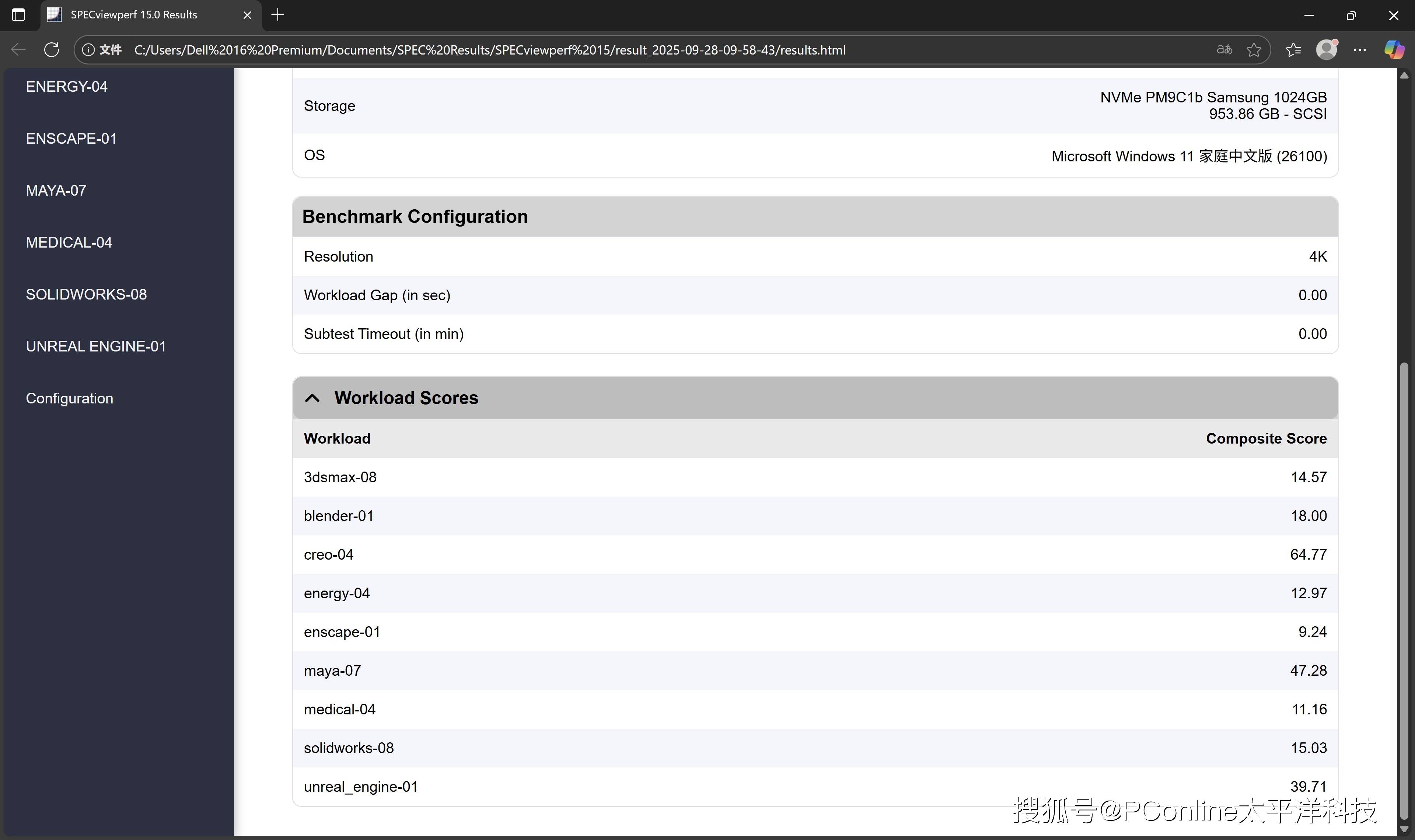 更有参考价值的,是SPECviewperf 15在多个专业图形应用中的表现。在 Blender、Maya、Solidworks、Unreal Engine等典型工作负载下,这台机器都能顺利完成测试,获得如Blender 18.00、Maya 47.28、Unreal 39.71的综合得分。从结果来看,RTX 5060 Laptop 在内容创作类负载中具备较好的兼容性和效率,也说明这套硬件平台的整合调教在专业创作场景中有较高的适配度。