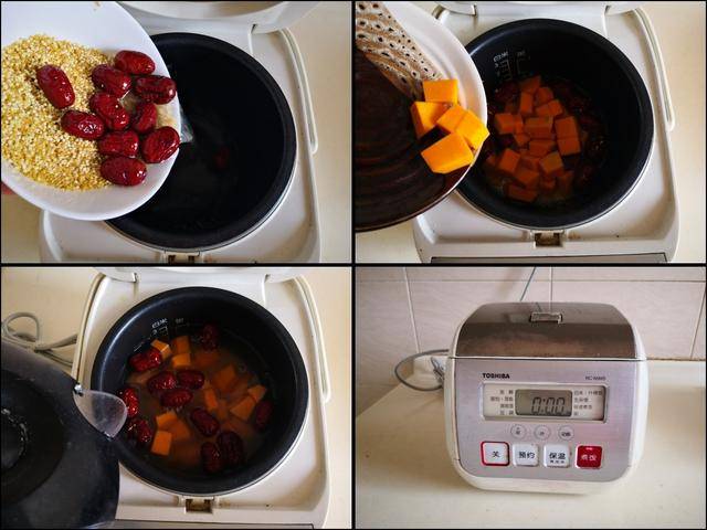 制作:将南瓜去皮后切成小块备用, 将准备好的小米和红枣放在一起洗净后放入电饭煲中,加入准备好的南瓜块,再加入适量的水; 按下电饭煲煮粥的功能键,时间到 “南瓜红枣小米粥”就熬煮好了。