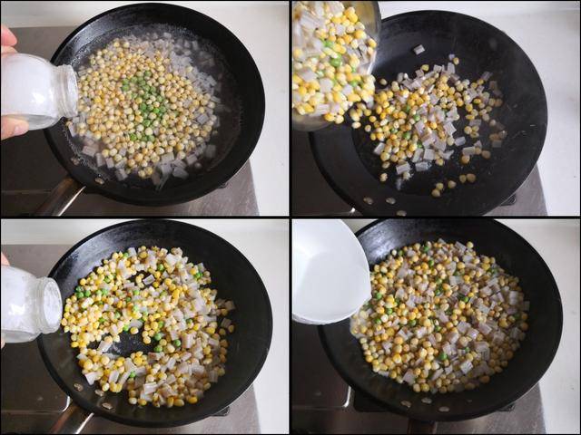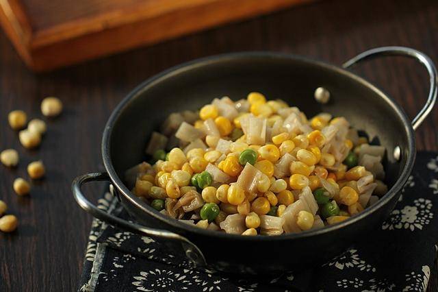 制作:选用水果玉米粒, 更加甜嫩多汁,口感更好; 将莲藕去皮后切成玉米粒大小的的丁备用。 烧锅水加入1小勺盐, 将准备好的玉米粒、莲藕丁和豌豆放入锅中焯煮两、三分钟,将其焯煮至九成熟后捞出备用。热锅凉油, 放入焯好的食材倒入锅中翻炒几下, 加入少许盐调味,最后加入少许水淀粉勾芡即可。