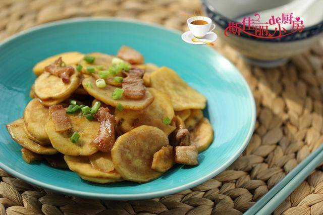 推荐菜谱【红薯炒肉片】 原料:红薯 五花肉 蒜片 葱花 生抽 料酒油盐
