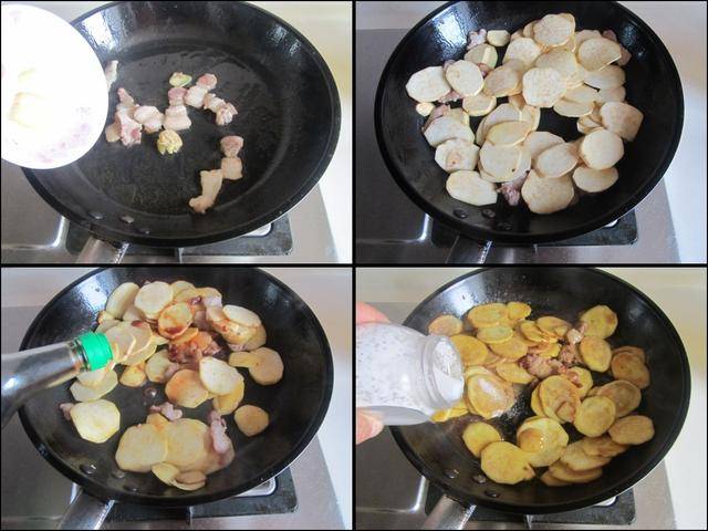 制作过程:将红薯去皮切成片备用; 五花肉和蒜都切成片备用。 烧热锅放入少许油,将五花肉放进锅中煸炒至微微出油,加入少许蒜片进锅翻炒几下,再将准备好的红薯片放进锅中翻炒几下,加入少许料酒和生抽翻炒,可根据情况加入少许水焖煮两分钟,待到红薯熟后加入少许盐调味,翻炒均匀盛入盘中, 最后撒上少许葱花。