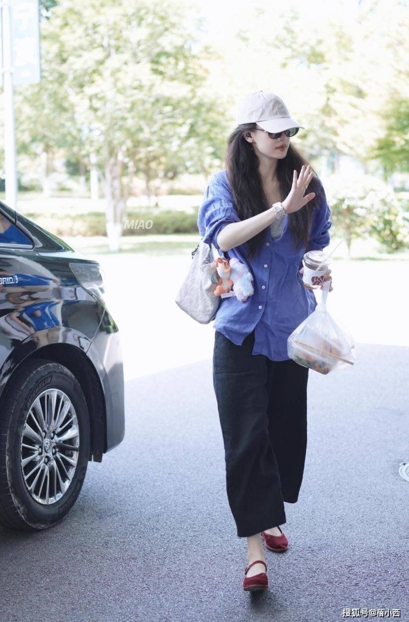 蓝衬衫贯穿秋季完全没问题,主要取决于是单穿还是叠穿。蓝色款不用说了,是非常流行的。这条黑裤子穿倪妮腿上像七分裤,而且版型很宽松,如果是单穿,夏天则很合适。当下是深秋,想要上腿必然是叠穿。微胖、腿粗的姐妹会面临身材不纤细的问题,如果穿修身款裤子便将这些无限放大,上身搭什么外套都很难拯救,因此,松量适度的阔腿版型很适合,其具有超级强的修饰效果。