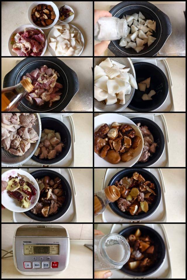 制作: 1. 准备好原材料, 香菇提前泡软备用; 2. 烧锅水加入1小勺盐,将笋块放进锅中焯煮两、三分钟捞出备用; 3. 烧锅水,将鸡腿肉放进锅中焯煮,加入姜片和料酒去腥; 4. 将焯好的笋块放入电饭煲中; 5. 加入焯好的鸡腿块放进电饭煲中; 6. 加入泡好的香菇和泡香菇的水; 7. 加入姜片和八角等大料; 8. 加入少许料酒和酱油; 9. 按下电饭煲煮米饭的功能键; 10. 待到煮好后加入少许盐和胡椒粉调味,翻炒均匀即可;