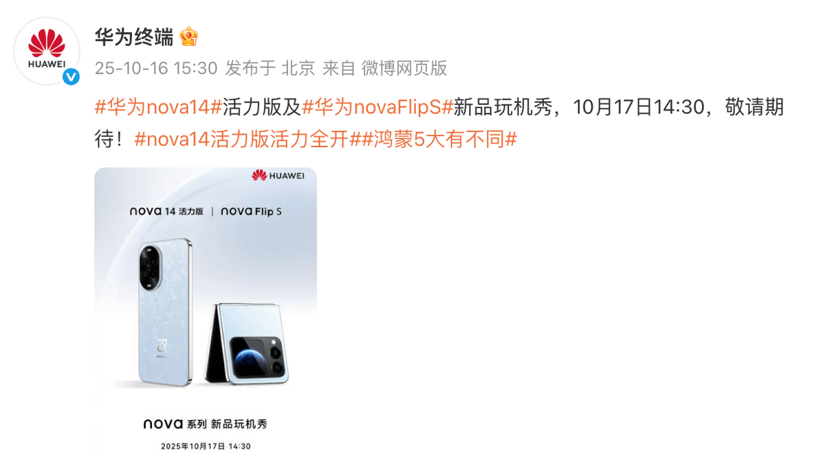 10月16日,华为终端官方释出一张华为nova系列新品玩机秀预热海报,主角正是备受期待的全新产品——nova 14 活力版。本次官宣,不仅首次清晰地展示了新机的核心设计语言,更直接预告了一场不容错过的线上直播,瞬间点燃了广大网友的热情。