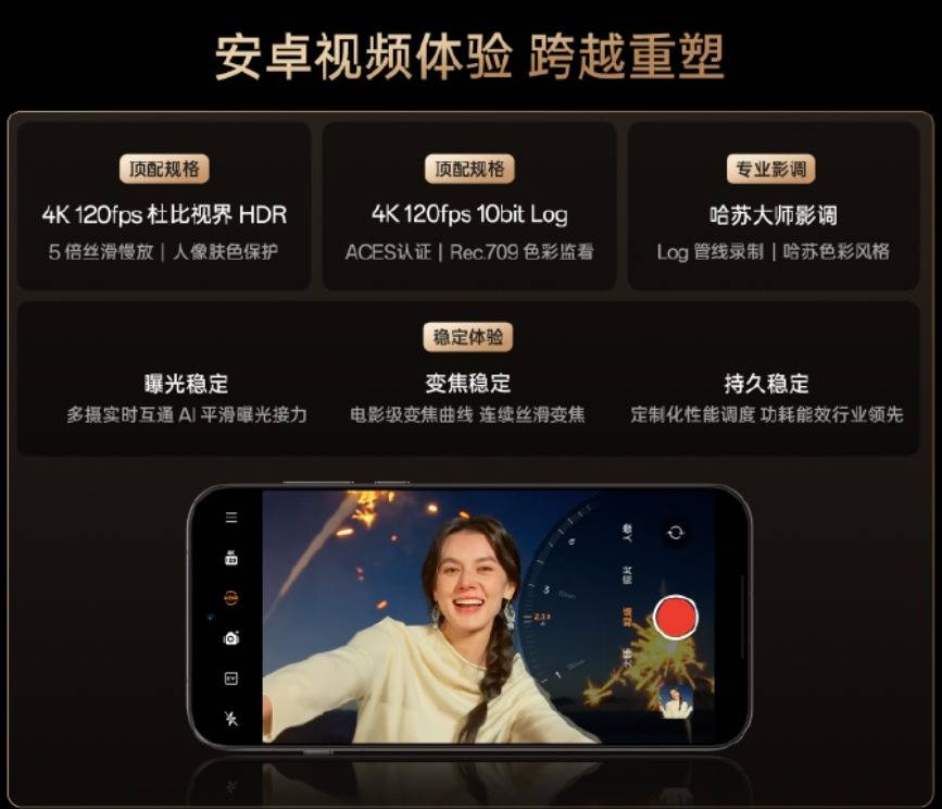 在视频拍摄方面,Find X9系列支持4K 120fps杜比视界 HDR 视频录制,提供5倍丝滑慢放效果,并优化人像肤色表现。同时,支持4K 120fps 10bit Log格式,具备ACES认证和Rec.709色彩监看功能,满足专业视频创作者的需求。