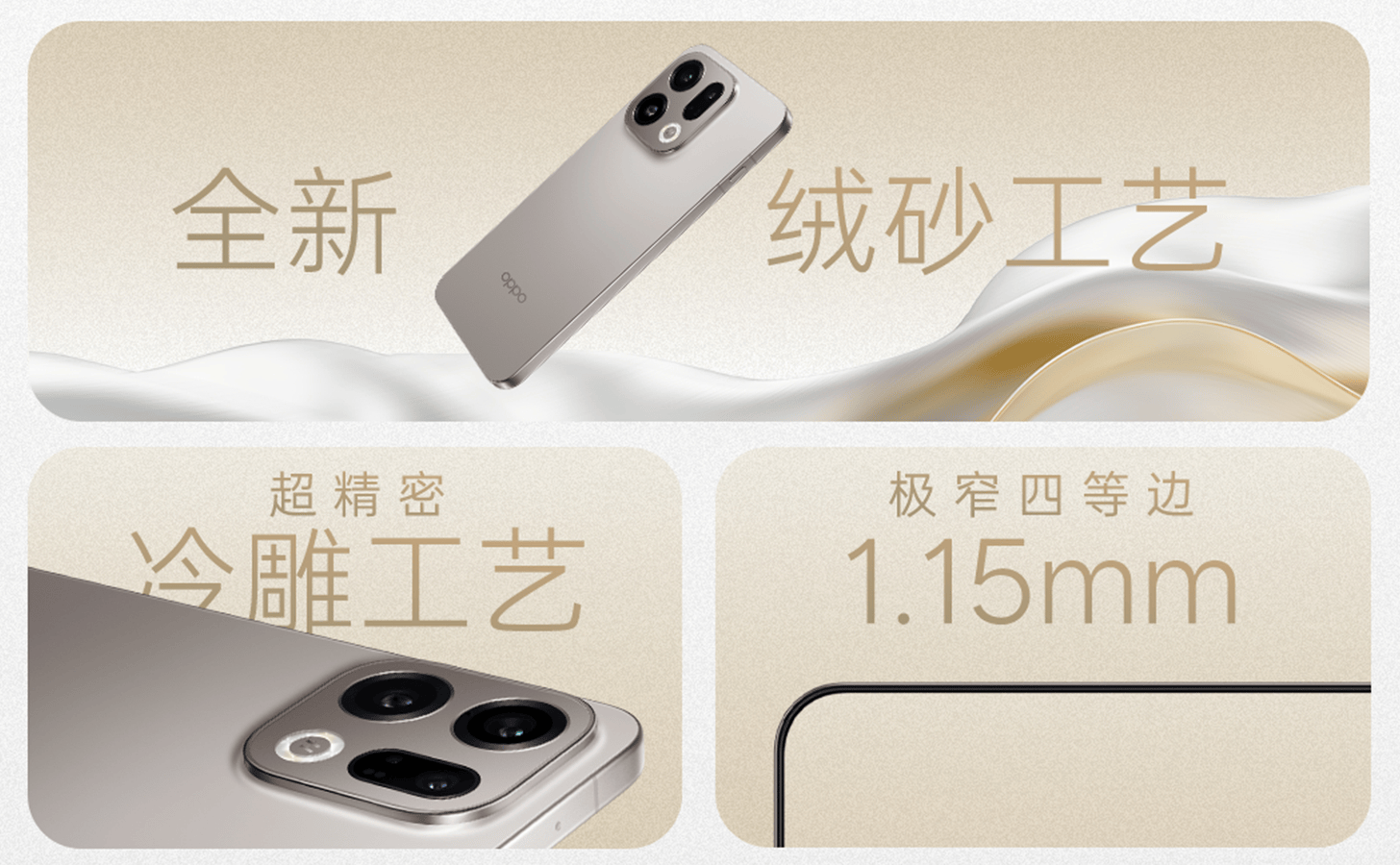 OPPO Find X9采用1.5K分辨率直屏设计,兼顾清晰度与能效表现。得益于LIPO封装工艺,四边几乎等宽,正面观感纯净利落,视觉一体感更强。上一代Find X8s已以1.25mm的极窄黑边超越iPhone 16 Pro Max,刷新行业纪录,而这一次Find X9再次突破,在四等边物理窄边上实现全系进化。