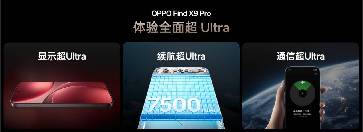 OPPO Find X9系列全系搭载最强天玑旗舰芯片天玑9500 ,配合新一代OPPO潮汐引擎,首发芯片级动态追帧与可编程调度器,大型游戏可5小时满帧运行。OPPO芯链技术更打破芯片与器件壁垒,让3nm旗舰算力赋能影像、屏幕、触控等全场景体验升级。Find X9系列全系标配大容量冰川电池,Find X9为7025mAh,Find X9 Pro更提升至7500mAh。而能实现电池容量的大幅提升,关键在于采用 OPPO 自研的完美球形硅碳材料与长寿算法,支持60个月健康耐用。Find X9系列全系标配自研山海通信增强芯片,实时优化网络,确保旅行中的稳定连接。