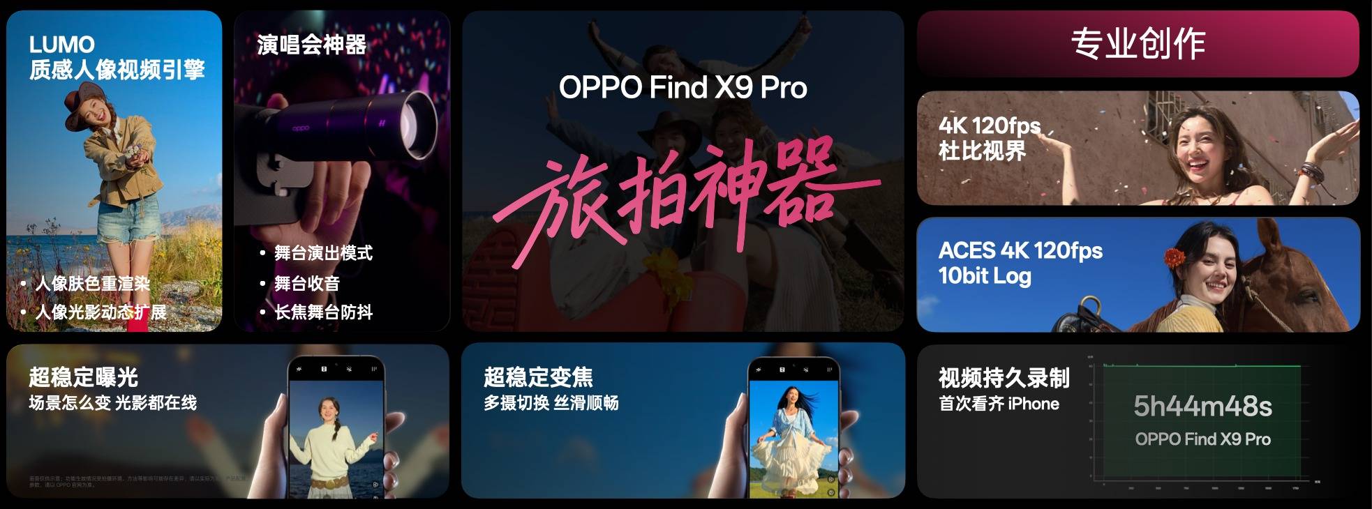 Find X9系列更支持4K 120帧杜比视界与10bit Log视频拍摄,满足专业创作需求。人像视频也能精准还原肤质,复杂场景下的收音、防抖及智能曝光能力也全面升级,使其成为全场景视频录制利器。