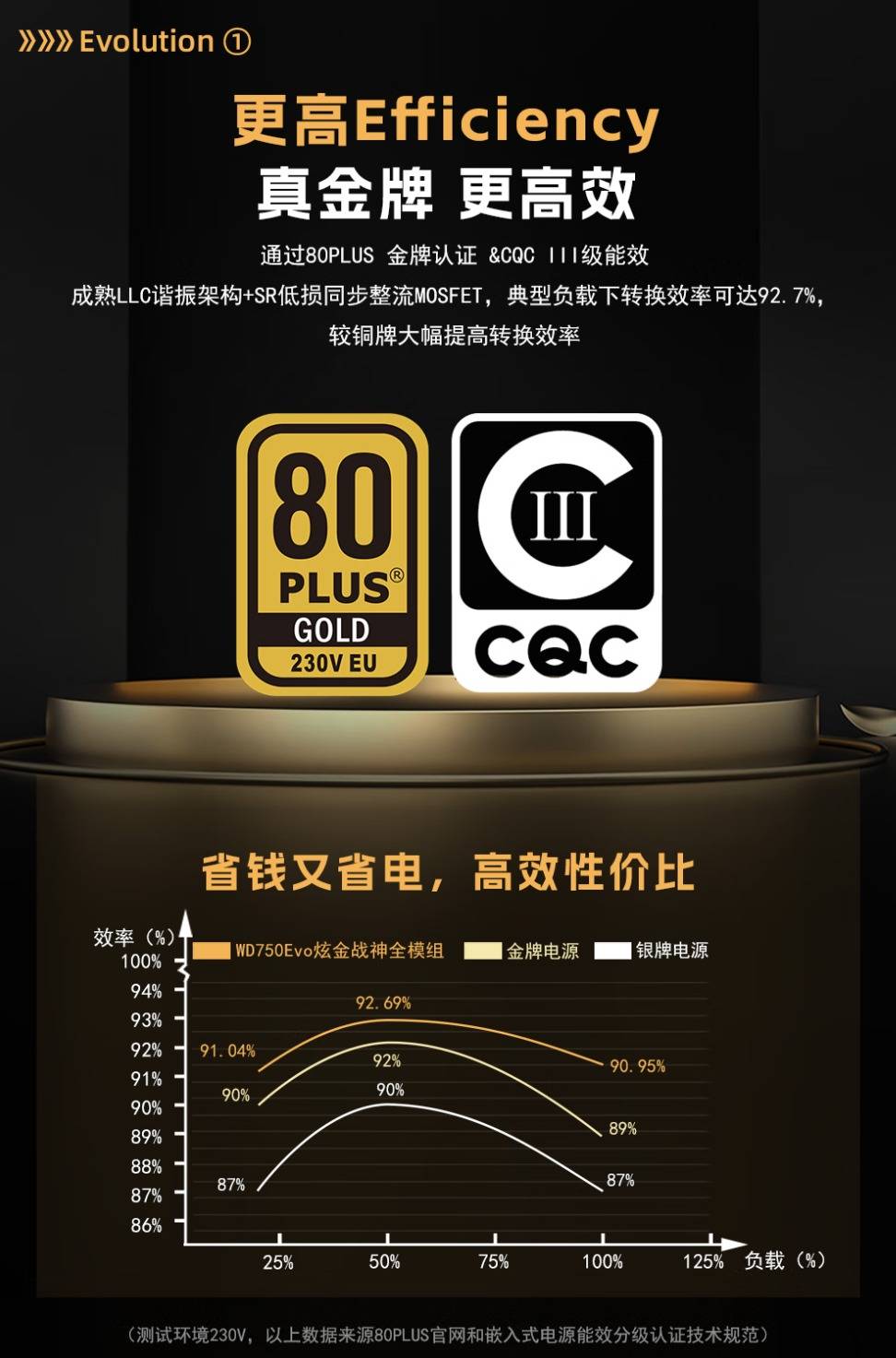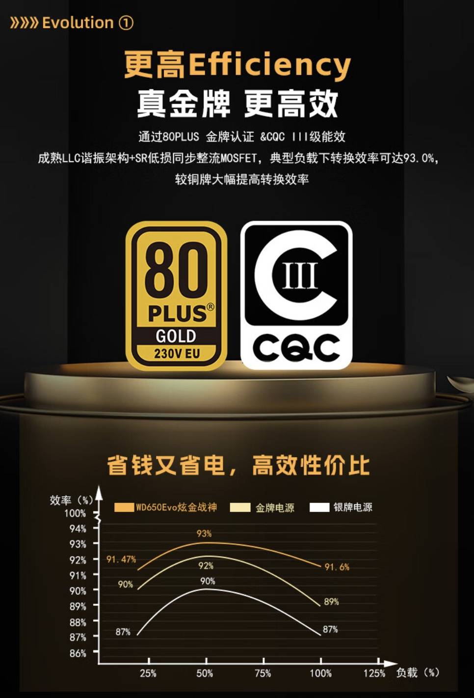 首先,让我们来看看这款电源的核心规格。WD650Evo炫金战神采用了成熟的LCC谐振架构,结合SR低损同步整流MOSFET设计,这大大提升了典型负载下的转换效率。通过80PLUS金牌认证,在230V输入下,50%负载时的转换效率高达93%,远超普通电源的标准。