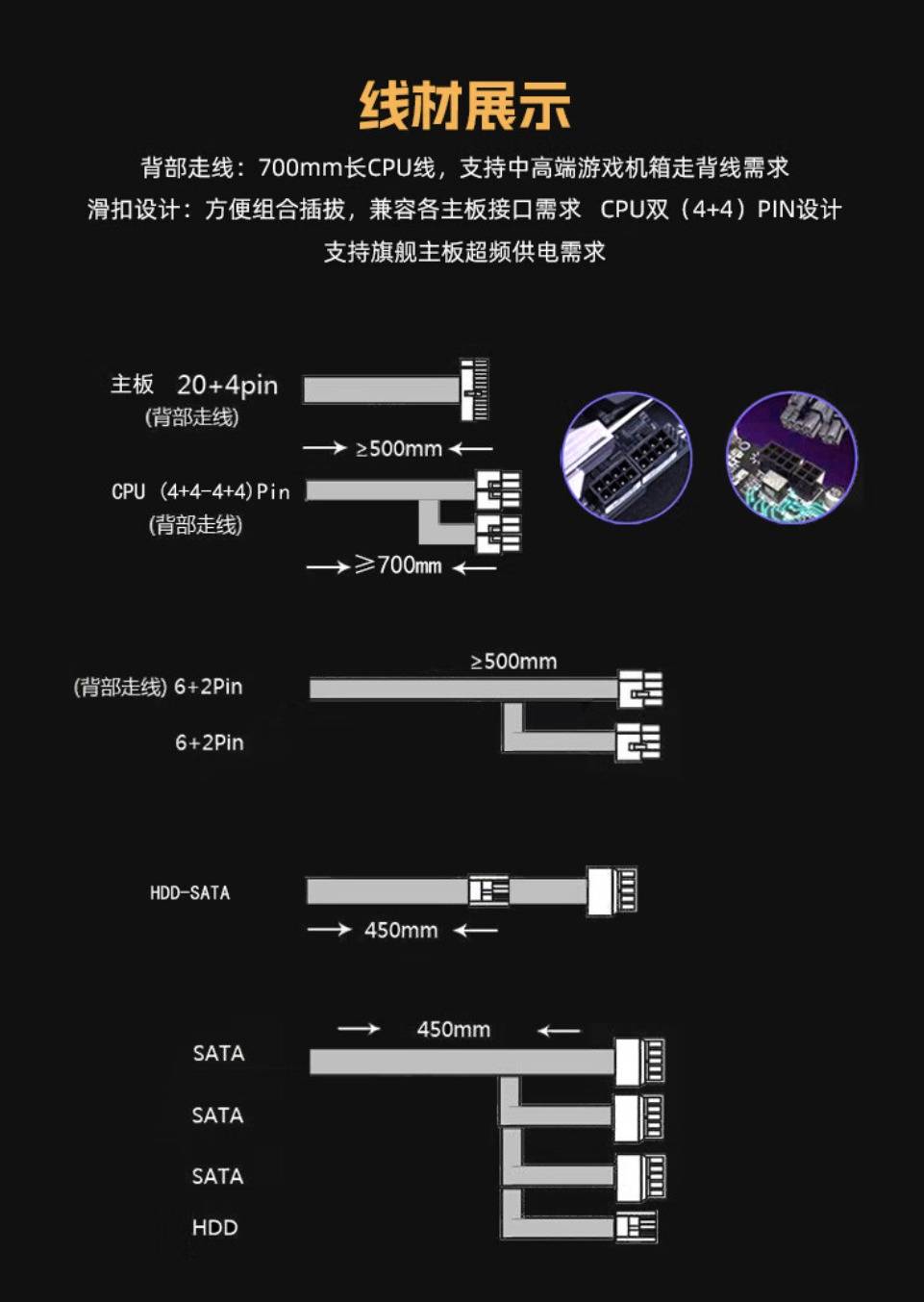 线材与接口设计则充分考虑了装机实用性。电源采用非模组方案,所有线材均为全黑配色,能完美融入各类高端装机风格,避免线材颜色杂乱破坏整机视觉。在长度上,CPU 供电线达到 700mm,其余线材长度也均在 500mm 以上,即便面对中塔、全塔等大尺寸机箱,也能轻松实现整洁的背线布局,让机箱内部更显规整。