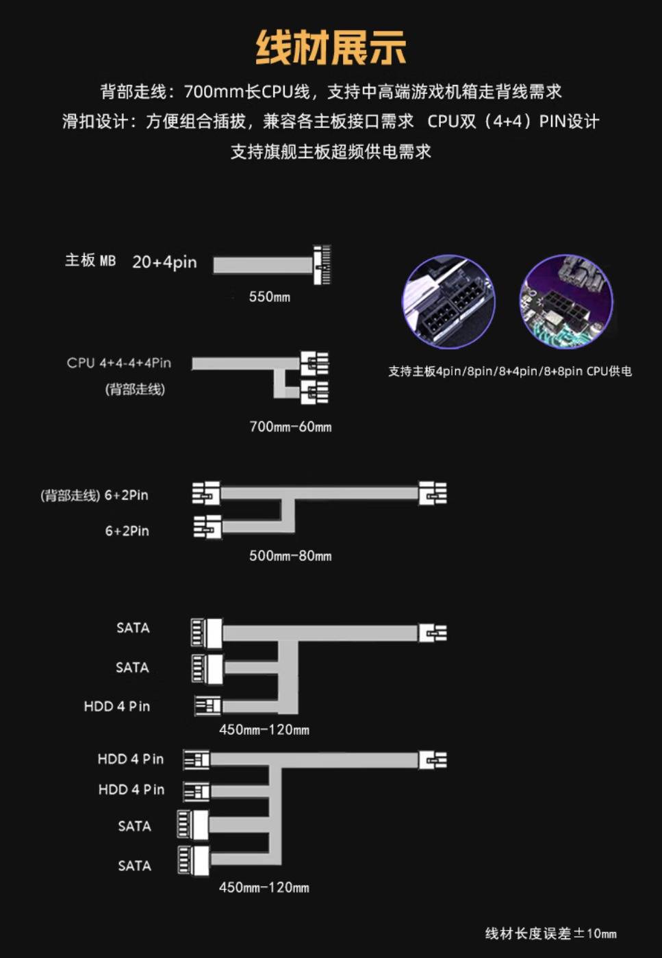 线材设计上,采用直出式全黑线材,CPU供电线长达700mm,和显卡供电线500mm,配备4个SATA接口和2个大4PIN接口,兼容市面上大多数和配件。