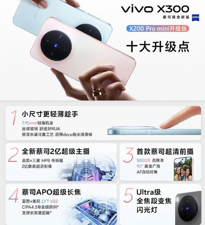 总结来看,vivo X300 Pro配备蔡司2亿超级长焦镜头、三星HPB传感器和CIPA 5.5防抖技术,确保动态场景下拍摄稳定影像;X300 Pro拥有7.99mm纤薄机身,全系搭载OriginOS 6和第二代半固态蓝海电池,具备IP68/IP69防护与超声波指纹解锁,带来全面升级的旗舰体验。
