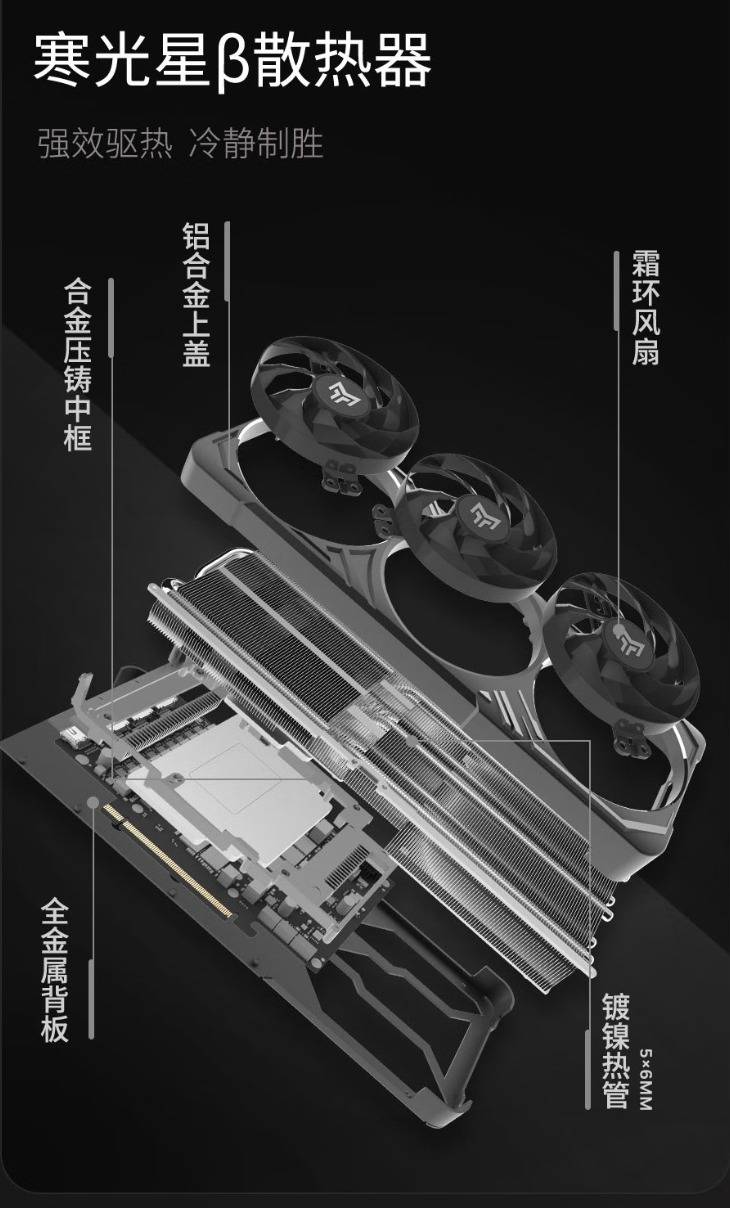 褪去优雅的外壳,其内部是全新的寒光星β散热器。三把90mm的“静霜”风扇,采用异构扇叶设计,可在提供强大风压的同时,有效降低风噪。散热器本体包含5根6mm复合式热管,通过回流焊工艺与大面积的纯铜均热板紧密结合,能够迅速将GB203核心产生的热量传导至高密度的散热鳍片上。