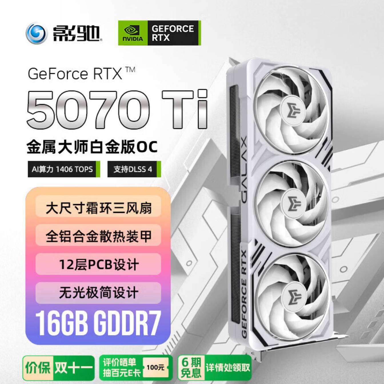 目前正值双十一购物狂欢节点,更是入手影驰GeForce RTX 5070 Ti金属大师 白金版 OC的好时机。现在京东平台到手价仅需6799元,并且价保双十一!玩家不仅有机会享受6期免息,评价晒单更有机会抽中百元E卡!赶紧戳下方链接购买吧~