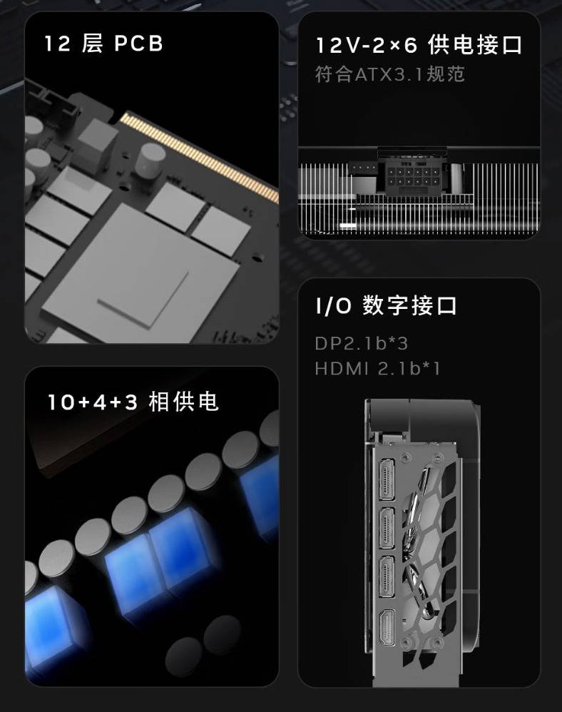 PCB板采用了12层加强设计和10+4+3相数字供电,为极限超频提供了无与伦比的稳定性。同时其默认TGP为250W,最大可解锁至320W,为追求极致性能的硬核玩家预留了充足的发挥空间。