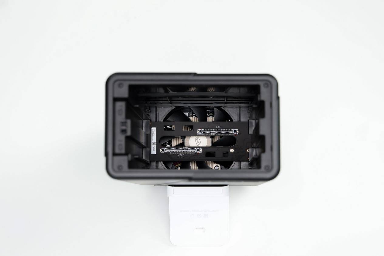 作为一款双盘位NAS,极空间Z2Ultra的巧思体现在其交互的便捷性上。机身顶部设有一键弹起式仓门,轻轻一按,硬盘仓便优雅开启。虽然硬盘固定到支架上需要借助随机附带的螺丝刀,但整个过程指引清晰,毫不费力。