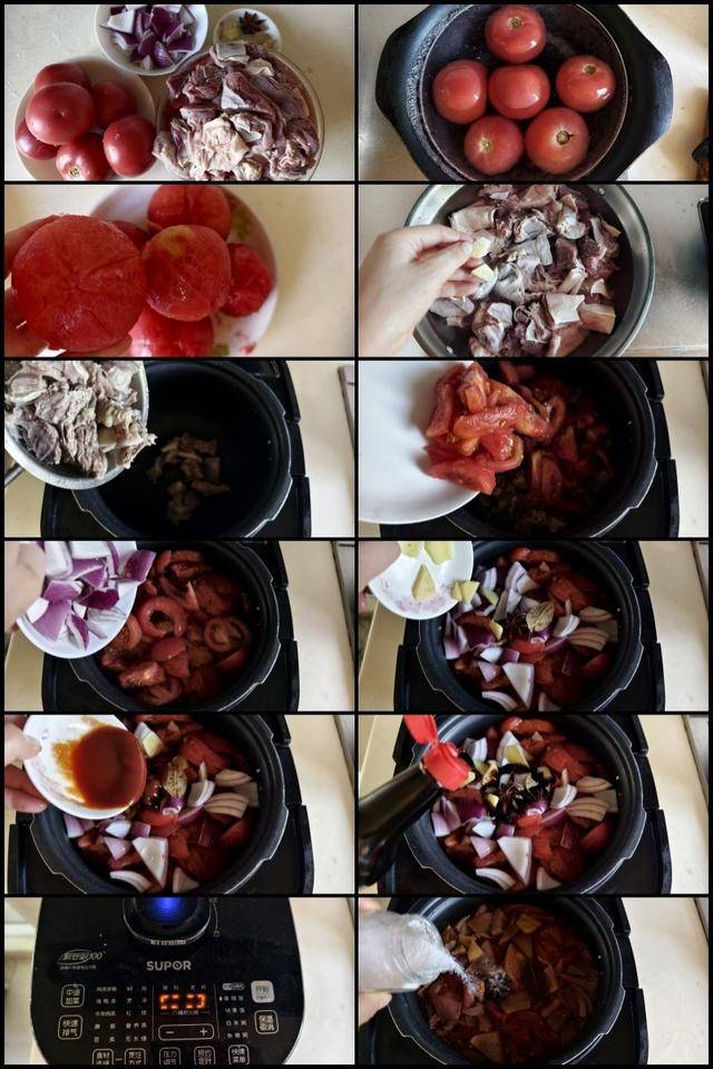制作:1. 准备好原材料; 2. 烧锅开水,将番茄整个放进锅中焯烫2分钟;3. 这样番茄皮很容易炸开, 将番茄皮处理干净后切成片备用; 4. 烧锅水, 将牛腩冷水下锅焯煮,加入少许姜片和高度白酒去腥,焯出浮沫后捞出用热水冲洗干净备用; 5. 将焯好的牛腩倒入电炖锅中; 6. 加入准备好的番茄块; 7. 加入准备好的洋葱片; 8. 加入姜片、八角、桂皮等调味料; 9. 加入1小碟番茄酱; 10. 加入少许料酒和生抽; 11. 按下电炖锅炖煮牛羊肉的功能键; 12. 炖煮好后加入少许盐和胡椒粉调味即可;