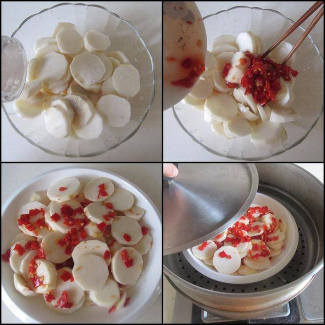 制作过程: 将小奶芋头去皮后切成薄片,加入少许盐和油拌均匀腌制五分钟入底味; 再加入1大勺剁椒拌均匀后腌制一下。烧锅开水,将芋头菜盘放入蒸锅中大火蒸上十分钟,将其蒸熟后拿出来撒上少许葱花既可。