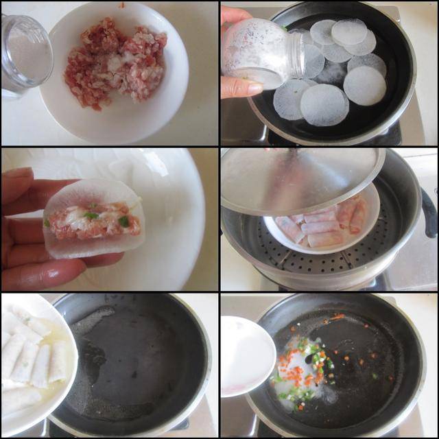 制作过程: 肉馅加入少许盐、淀粉、料酒、生抽和姜末等调味料,顺着一个方向搅拌上劲后腌制五分钟备用; 白萝卜去皮后切成薄片, 越薄越好, 烧锅水加入1小勺盐,将准备好的白萝卜片放进锅中焯煮两分钟后捞出备用,这样处理过的白萝卜片会变软。将少许肉馅酿入白萝卜片中,摆放在盘中,烧锅开水,将菜盘放进锅中大火蒸上十分钟,将其蒸熟。将蒸熟的白萝卜菜盘拿出来, 将水分滗去倒入锅中,加入少许盐、葱花、胡萝卜丁, 再加入少许水淀粉勾芡,最后将芡汁倒在蒸好的白萝卜卷上。