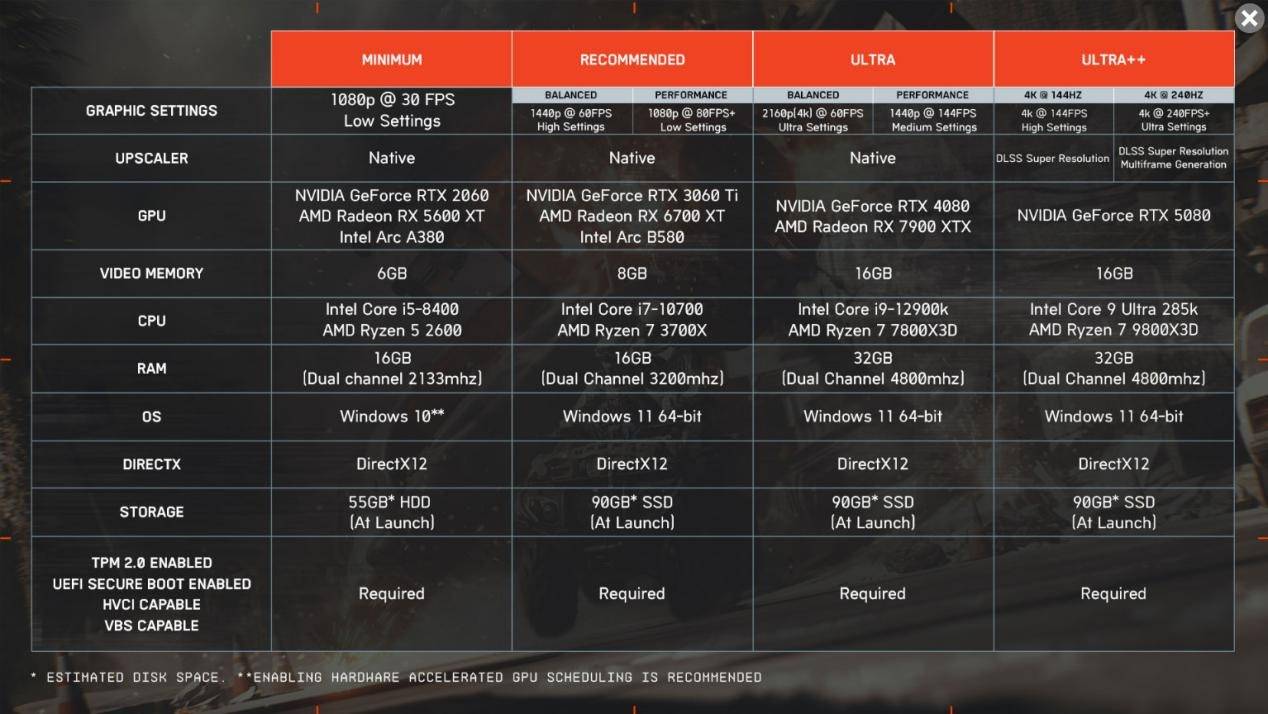 《战地风云 6》对硬件的胃口不小,尤其是大规模对战与破坏效果,需要强劲的计算能力。官方最低配置勉强能跑1080p@30低设置,但推荐配置已直指RTX 40系列中端,也仅是支持2K@144中配置的游戏。