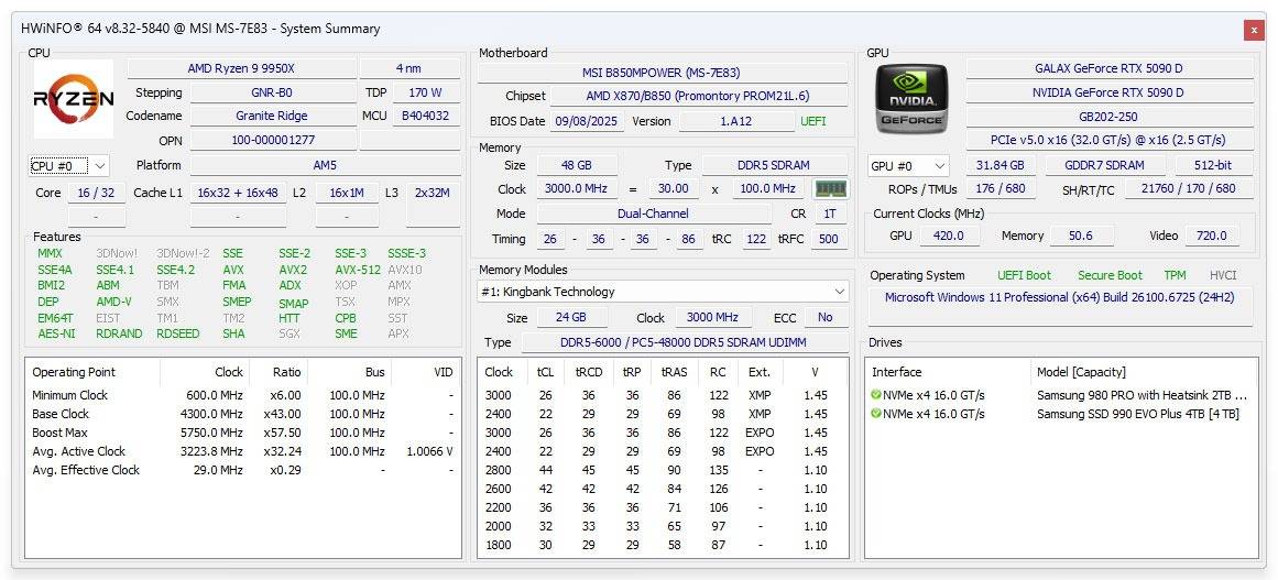 测试平台方面, 我们选用了锐龙9 9950X处理器、配合上微星B850MPOWER主板、48GB内存,以及一套三星980 Pro 2TB+990 EVO PLUS 4TB硬盘进行组合,确保存储性能不会成为瓶颈。