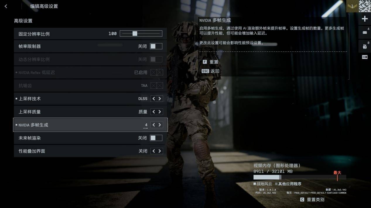 值得注意的是DLSS 4所有设置都在高级设置下,上采样技术选择“DLSS”会开启相关模式的选项。当然还有FSR和XESS技术可选,但是若使用上NVIDIA GEFORCE RTX 50系列GPU,那么你就可以开4倍DLSS 4多帧生成,也就是全满技术的DLSS 4。