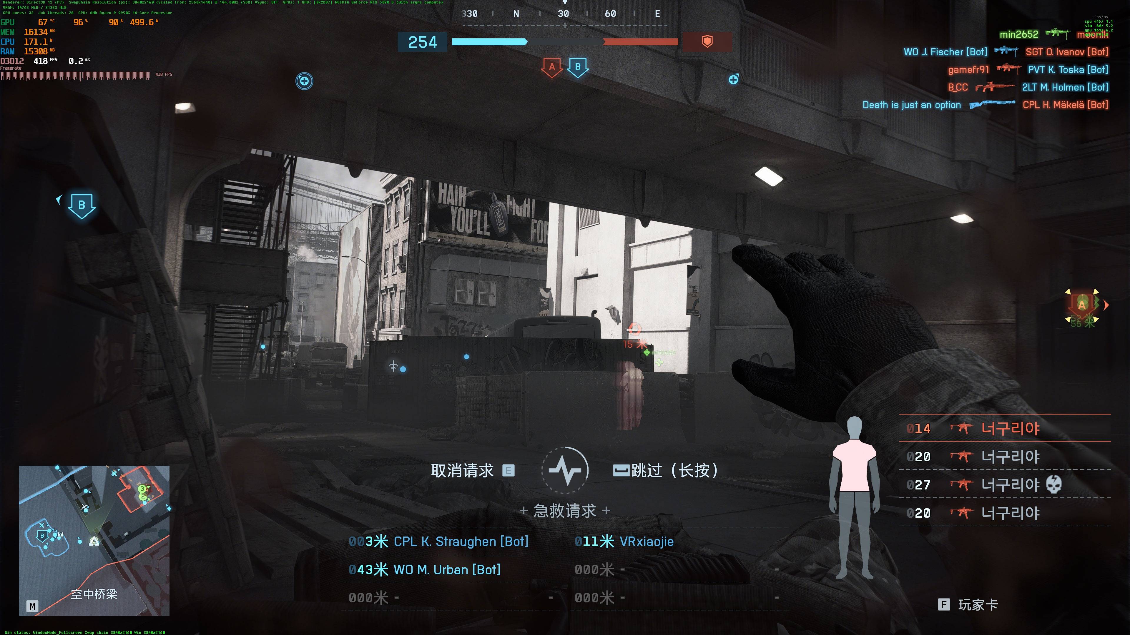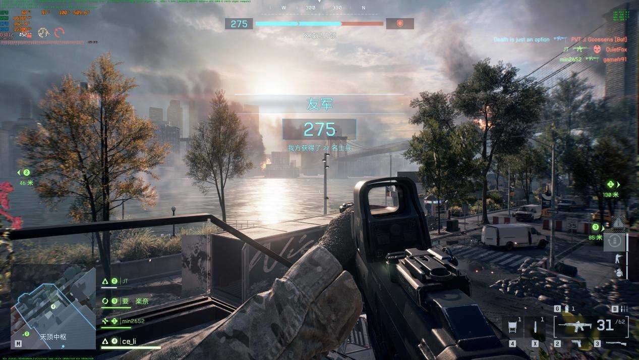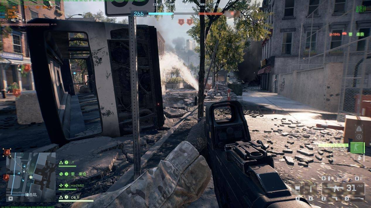 场景中包含大量可破坏建筑、动态烟雾与实时反射效果,我们开启极致画质并关闭帧率限制。