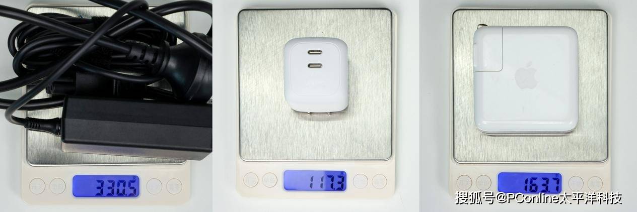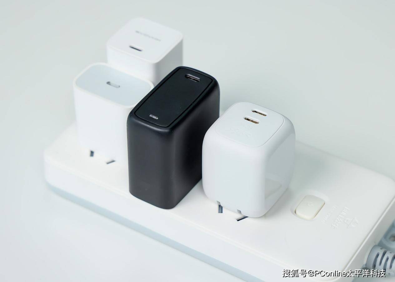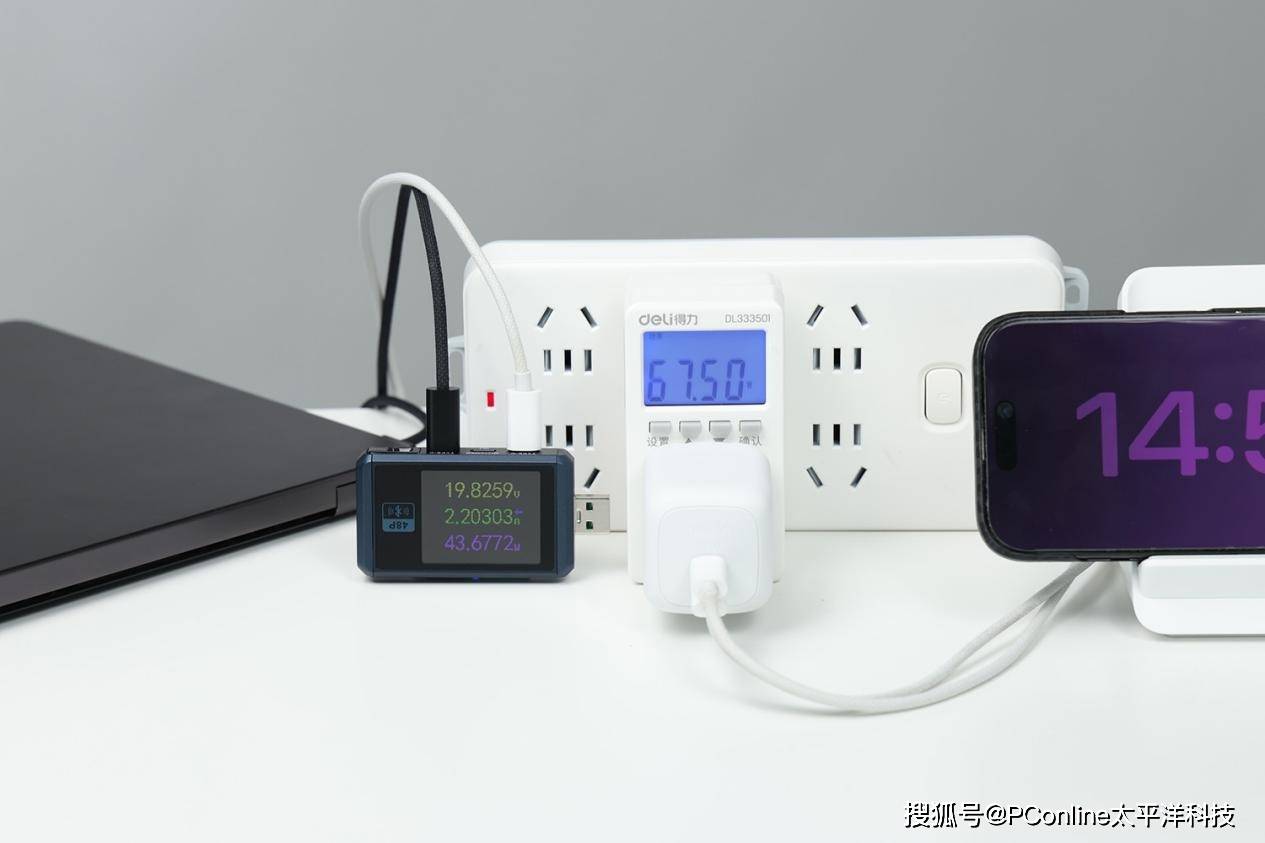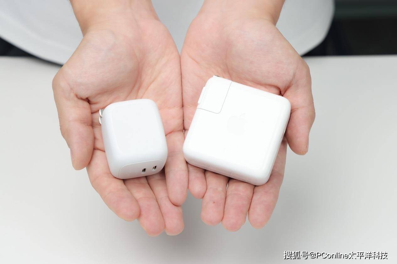 为了更直观地展示其小巧,我们将其与苹果电脑原装70W充电器并置,可见它的体积缩小了近一半。配合双C口设计,手机+充电宝可以同时补能。