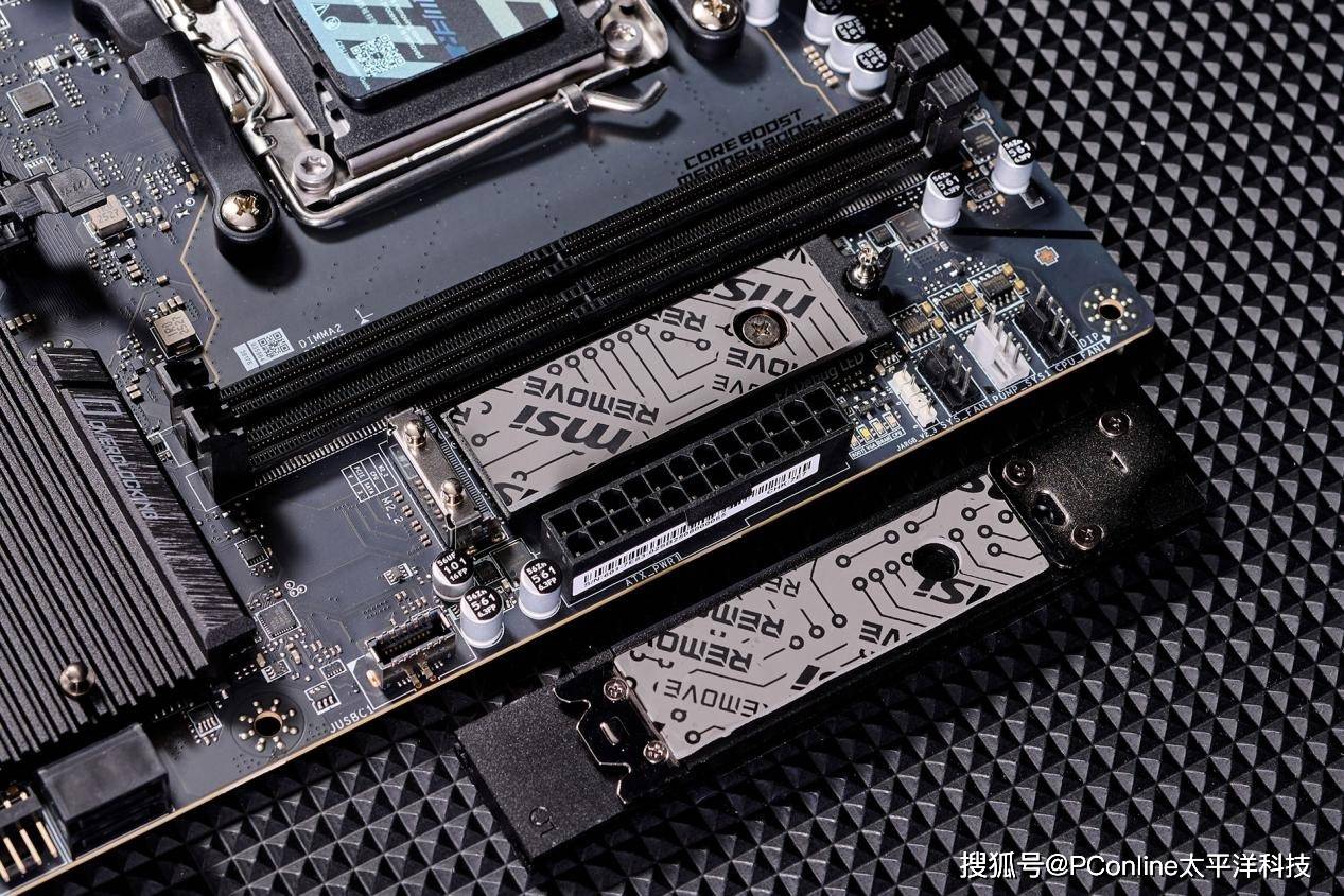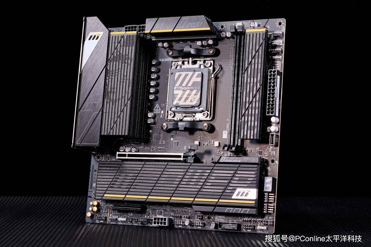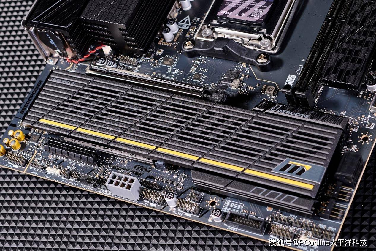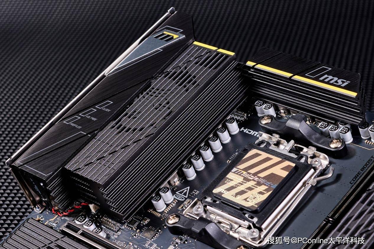 主板供电部分覆盖厚实的金属散热装甲,左侧散热片面积相当巨大,延伸至IO面板区域,表面压印有MSI微星标准性的龙纹,触感冰凉坚实。