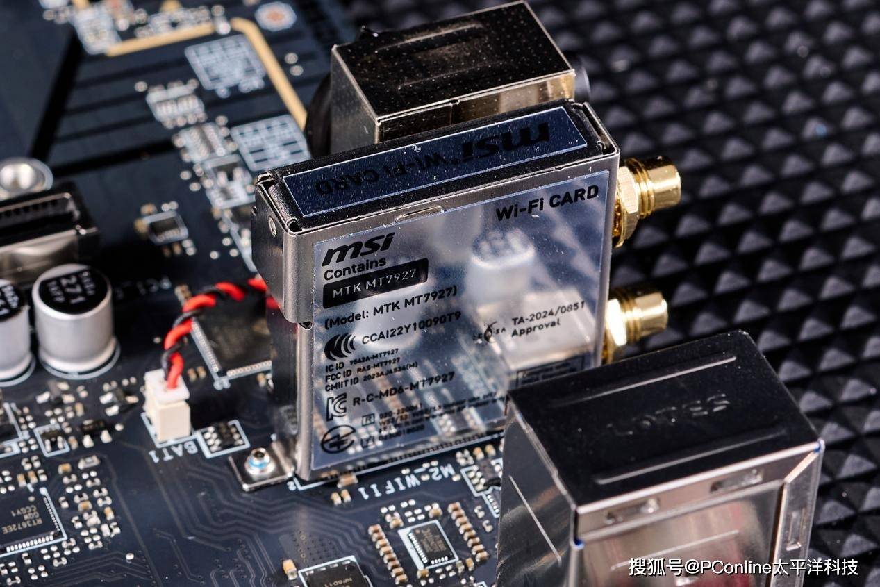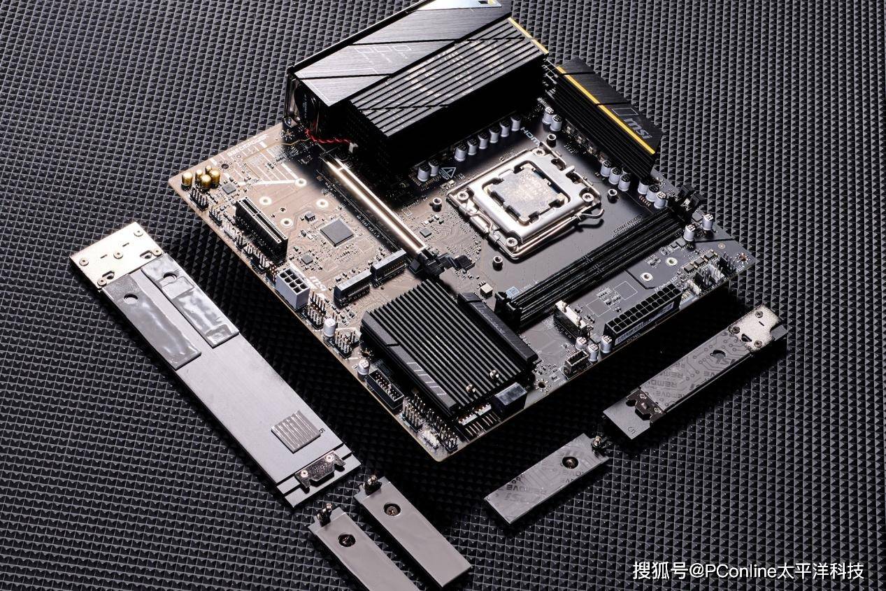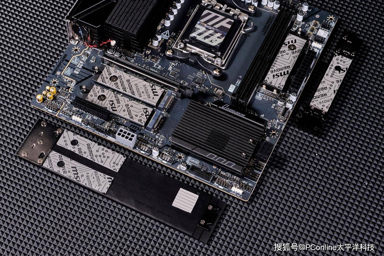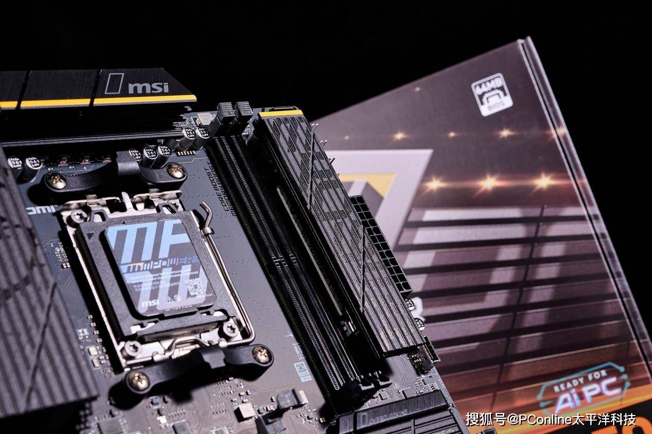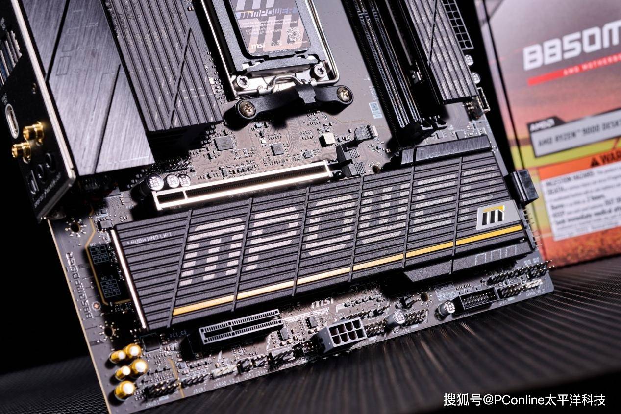 主板供电部分覆盖厚实的金属散热装甲,左侧散热片面积相当巨大,延伸至IO面板区域,表面压印有MSI微星标准性的龙纹,触感冰凉坚实。